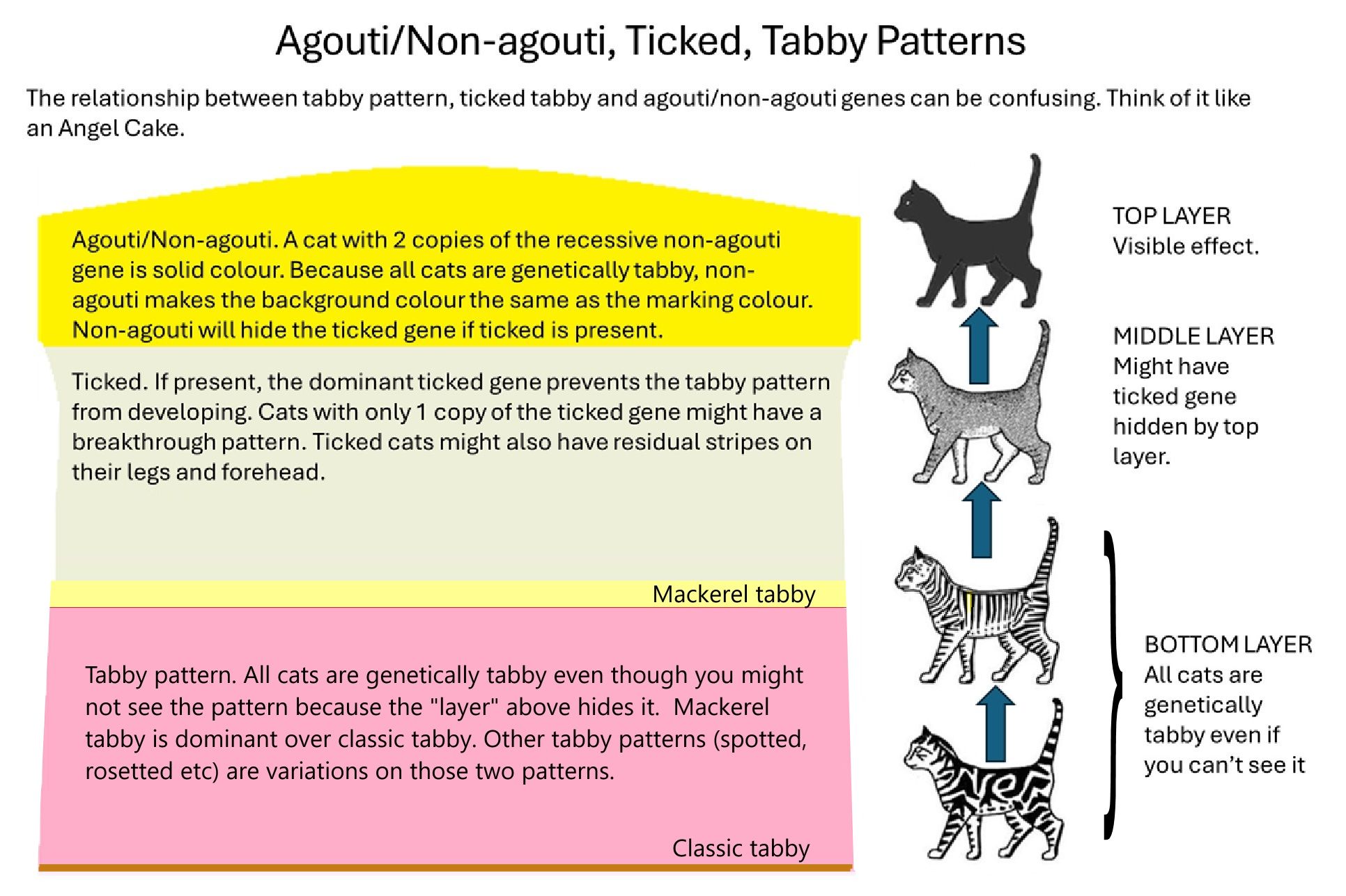 A gene series must occupy the same loci on pairs of chromosomes. Some websites based on older texts incorrectly show tabby as a series of genes in the following order of (most dominant first): Abyssinian (ticked) Tabby, Mackerel Tabby, Classic Tabby. This is incorrect because Abyssinian Tabby is on a different locus.