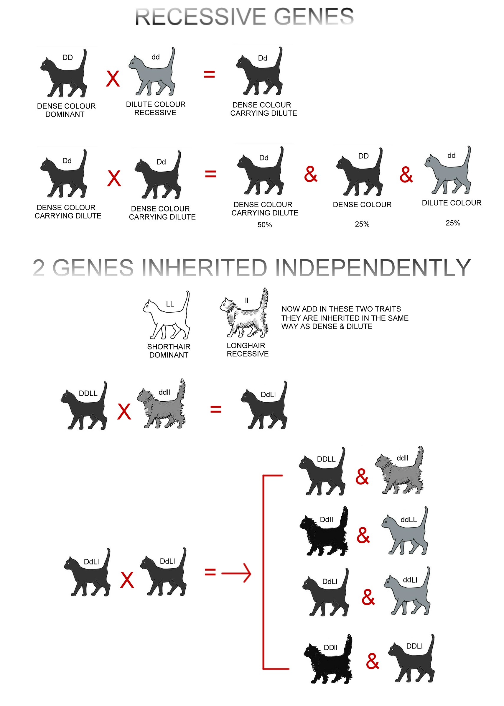 It used to be believed that mating a black cat to a white cat would result in grey cats. Mating grey cats to white cats was believed to give paler grey cats. This theory is called blending. The existence of dominant and recessive traits was not widely understood and breeders had no other explanation for where the grey kittens came from (white masks all other colours; black masks grey - the grey kittens occur becasue of recessive grey genes). Where an animal inherits 2 different co-dominant genes, it is intermediate in type between the parents (Tonkinese pattern). Another example where a form of blending occurs is with multiple genes (polygenes) where the overall intensity of colour depends on multiple genes inherited from the parents.