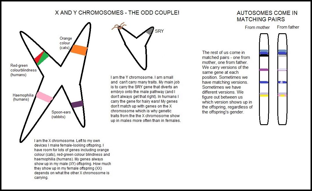 A chromosome is a length of DNA. In cats, as in humans, autosomes (chromosomes other than X or Y) occur in pairs. Cats have 19 pairs of chromosomes. The matching strands of DNA form a double helix. The exception to this are the sex-determining chromosomes X and Y. A gene is a stretch of DNA that, in simple terms, encodes for a trait such as long or short fur. On the autosomes, genes occur in pairs - one on each strand. These genes may be identical or they may be slightly different variations of the same basic gene. The variants are called properly called alleles of genes, but for simplicity I shall call them genes (they should also be called "gene for black", "gene for grey" etc, but I shall refer to them as "black gene", "grey gene").