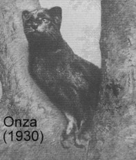 The Onza (Mexico, Central America) was long dismissed as a myth. Its name is derived from "uncia" (Latin for "cheetah") making it distinct from the "leon" (puma) and "tigre" (jaguar). It was described in 1757 as being less timid than the puma and having a longer, thinner body. Mirko Wolfling, of the University of Wurzburg, has provided a scan of the original first German edition of Linne (Linnean) "System of Nature" (1773) with the first natural history description of the animals: "The Panther Felis Onca. Even if females of the Leopard are called Panther, nevertheless we think this name is the best for this animal. The Portuguese call it Onza because it is similar to a Lynx because of its dots. But Hernandes is calling it the Mexican Tiger." It is interesting that Linne uses both spellings: Onca and Onza (and Onza apears in a different font in the section). But in connection with Hernandes and the Portuguese and the name Mexican Tiger, it appears to be different species mixed up. The creature identified as an onza in the 1920s and 1930s appears to be the jaguarondi (which can be tamed). It can be found in "Wonders of Animal Life" edited by J A Hammerton (1930) with the caption "a cat-like animal called the onza which is only found in Central and South America. Jaguar hunters in 1938 shot an onza and gave a similar description, adding that its limbs and ears were also longer; the skull was donated to a museum, but has since been lost. It was also linked to the Pleistocene cheetah and later said to be a cheetah-like puma adapted for sprinting after prey. A shot specimen was initially described as an emaciated puma based on the photos. The onza, now known from more than one specimen, has since been classified as a gracile form of puma with a few other differences such as longer ears and striped marking on its forelimbs. In 1998, final test results were made public in the journal Cryptozoology: tissue samples were found not to be of a distinct species, but were indistinguishable from those of the North American puma. It remains to be seen if onzas and pumas can occur within the same litter (like cheetahs and king cheetahs), whether it interbreeds with the puma or whether it is a separate species/subspecies or is evolving into a separate species. In any case, the modern onza seems to be a type of puma while the historical onza may have been the jaguarondi.