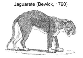 The Cougar Noire or Jaguarete (Brazil and Guiana [Guyana]) was described as a scarce species in the 18th century and depicted in Thomas Bewick's "General History of Quadrupeds" (1790) and in Buffon's Natural histories (below). It is also called the Black Tiger ("tigre" being Spanish for jaguar) " The black tiger's hair is blackish, interspersed with spots even blacker than those of the jaguar." Note: "Jaguarete" is now used for the ocelot, but the 18th century Jaguarete was a jaguar-like big cat. Its head, back, sides, fore part of the legs, and the tail were covered with short and very glossy dusky-coloured hairs and are sometimes spotted with black, but generally lacked markings Its upper lips were white, with a black spot at the corner of the mouth. There were long hairs above each eye and long whiskers on the upper lip. The lower lip, throat, belly and the inside of the legs are whitish or very pale grey. The paws were white and the ears were pointed. The Jaguarete grew to the size of a year-old heifer. According to the naturalist Thomas Pennant, two jaguaretes were exhibited in London during the 18th century. The most likely explanation is the pseudo-melanism (abundism) mutation; this would not be unexpected in jaguars and has been recorded in African leopards. A less likely alternative is the black-and-tan mutation as seen in many dogs; surprisingly this is a mutant form of agouti (ticked tabby pattern)!