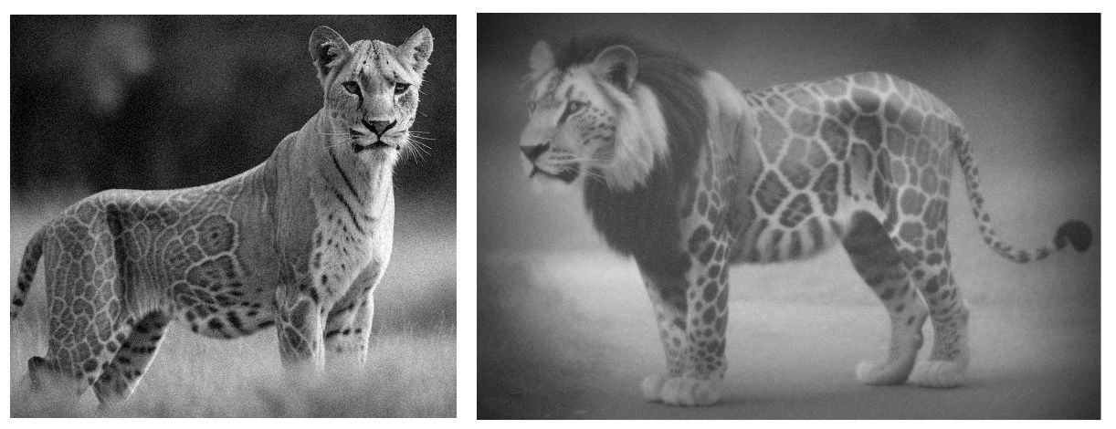 Lion and tiger hybrids: In some states, there was (possibly still is) a legal loophole making it permissible to keep hybrid big cats, but not purebred lions or tigers. There is a report of a lion x black jaguar cross (male) and a tiger x black jaguar cross (female) sighted together in Maui, Hawaii. There are no known tiger/jaguar hybrids and the descriptions match those of a lion and a liger (and it would be reasonable to find these two animals together since lions are social, but jaguars and tigers are not). The alleged lion x black jaguar male was had a scarred grey face, short, thick black mane confined to the head and neck, solid dark tawny body and black tufted tail. The identification of lion x jaguar hybrid was made by the observer based on facial appearance. Known hybrids have chocolate rosettes on a tawny background colour. The description matches that of a lion, the grey face being due to lighting or dried blood. The alleged tiger x black jaguar was larger, maneless and had both stripes and "jaguar-like" rosettes on its sides. The assertion of hybrid identity was due to the combination of black, dark brown, light brown, dark orange, dark yellow and beige markings as well as tiger-like stripes radiating from its face. This description matches that of known ligers, some of which appear brindled. Ligers have a mix of rosettes (lion juvenile markings) and stripes, as well as having the larger size described.