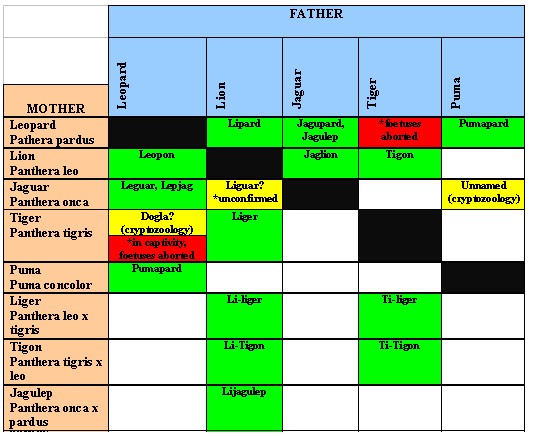 While lions, leopards and jaguars all form viable hybrids with each other, the tiger has only formed viable hybrids with the lion (tiger/leopard matings resulted in aborted foetuses). None of the species have been mated to the extremely rare snow leopard (captive snow leopards are part of conservation programmes and therefore not available for frivolous cross-breeding).