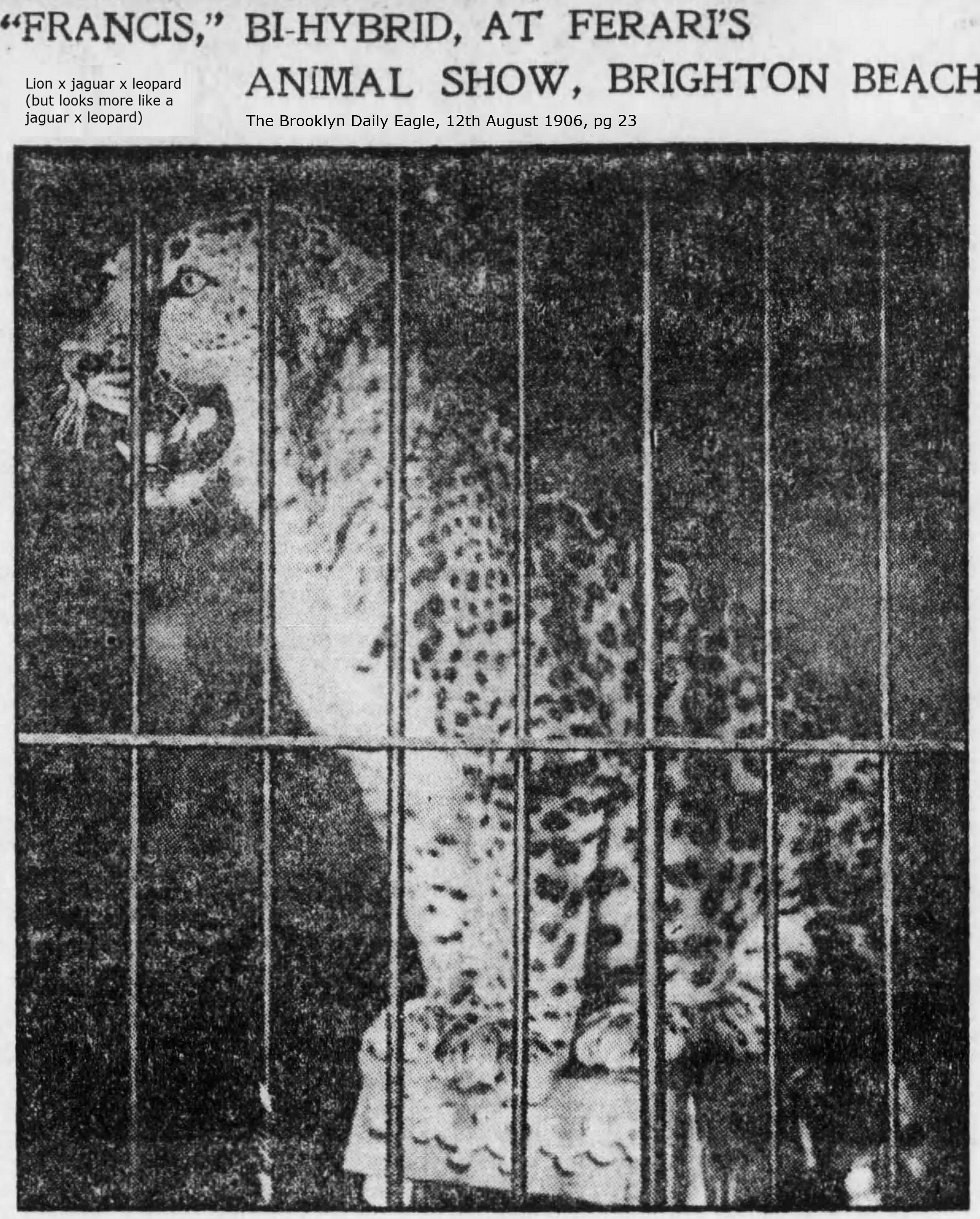 From The New York Times of June 4th, 1906, we have this item that says four lion-leopard-jaguar hybrids had been born. “ALL HYBRIDS AT CONEY. Some Beasts There Are Bi-Hybrids This Year — All Are Mighty Rare. Bulletin chased bulletin out of the animal shows at Coney Island yesterday. A Coney Island animal show is a cheap affair this year if it hasn’t at least one hybrid; naturally the press agents aren't forgetting that fact. CoL Francis Ferrari has a collection of; wild beasts at Brighton Beach Park. Four of his pets he called bi-hybrids. Their father is a full-bred native African lion and the mother, it is asserted, is a cross between a jaguar and a leopard. The four youngsters are described as the most peevish little rascals that were ever in captivity. Col. Ferrari gave zest to the day's news by declaring yesterday that he would give $20,000 if any animal man could produce their like. Following this offer. Bostock’s press agent announced, with tears in his voiced that “Tricolor,” the Bostock hybrid, had just died. At the same time, however, there were born to the lioness Princess two tiny cubes Their father is said to be a cross between a puma and “the famous self-eating Jaguar whose favourite occupation is biting a section of his own tail off.” Tricolor was only a cross of a puma, a jaguar, and a lion. That, the press agent says, is quite a common cross. The new cubs, of course, are very rare.”