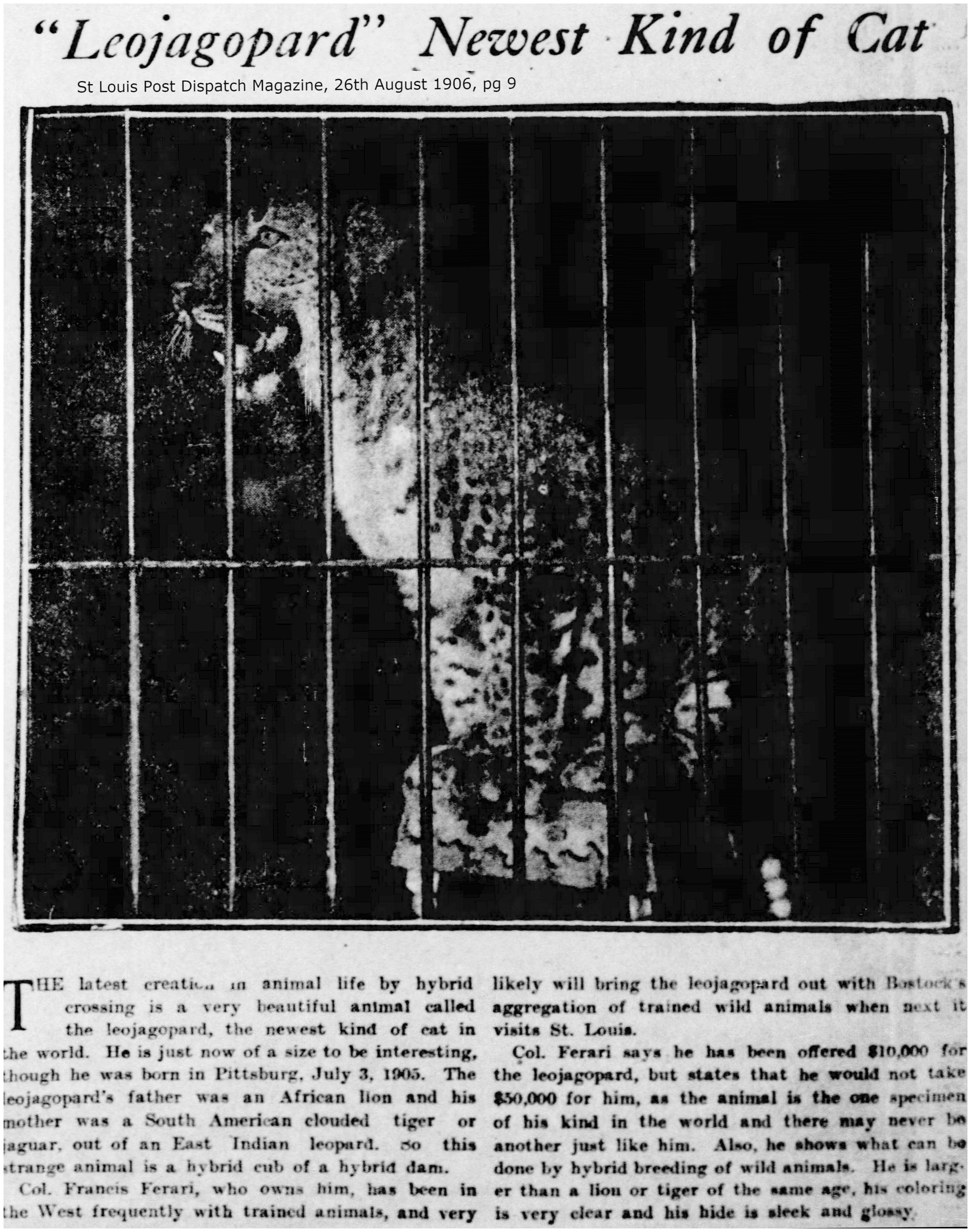“LEOJAGOPARD” NEWEST KIND OF CAT. St. Louis Post-Dispatch (Missouri), 26th August 1906, pg 49