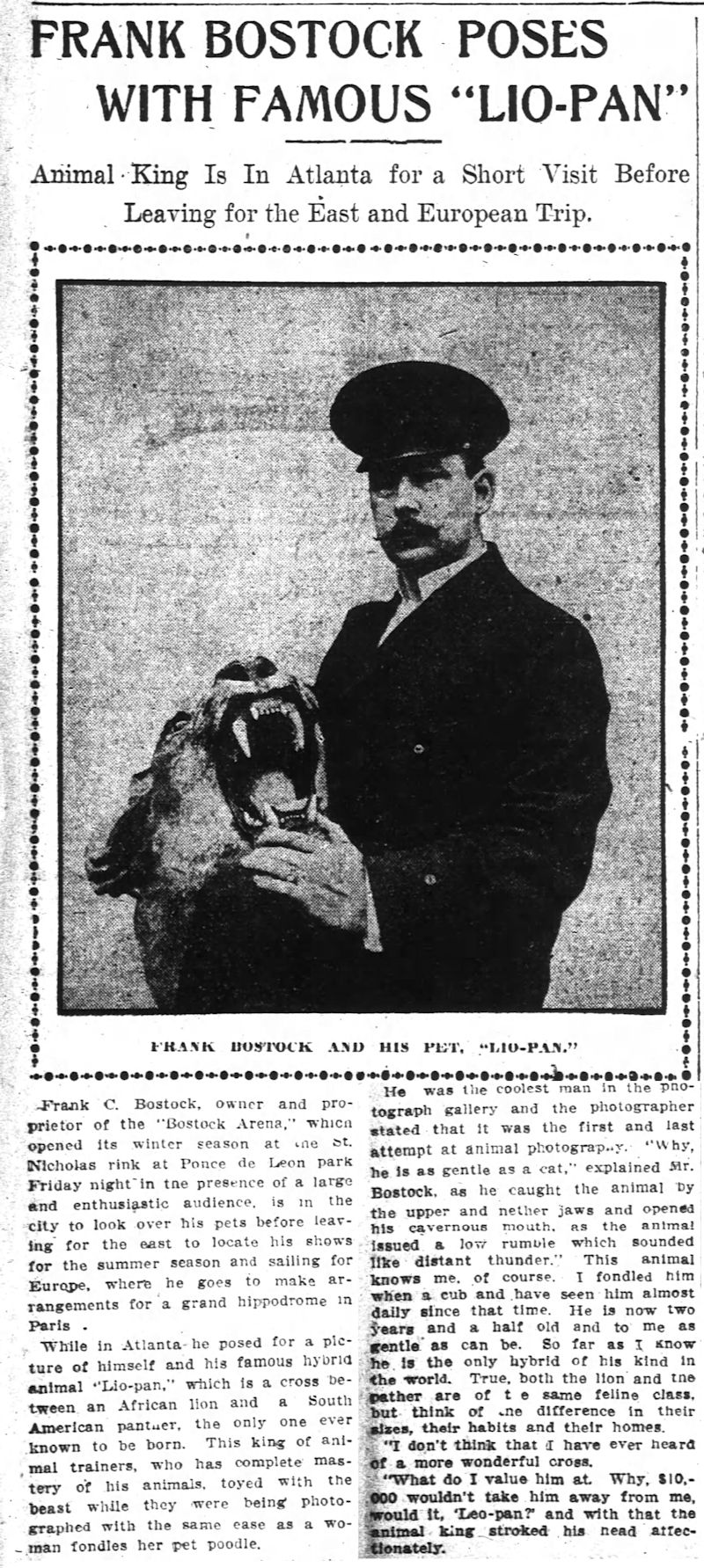 The Atlanta Constitution, November 10th, 1907: FRANK BOSTOCK POSES WITH FAMOUS “LIO-PAN” Frank C. Bostock, owner and proprietor of the “Bostock Arena,” which opened its winter season at The St. Nicholas rink at Ponce de Leon park Friday night in the presence of a large and enthusiastic audience, is m the city to look over his pets before leaving for the east to locate his shows for the summer season and sailing for Europe, where he goes to make arrangements for a grand hippodrome in Paris . While in Atlanta he posed for a picture of himself and his famous hybrid animal "Lio-pan," which is a cross between an African lion and a South American panther [jaguar], the only one ever known to be born. This king of animal trainers, who has complete mastery of his animals, toyed with the beast while they were being photographed with the same ease as a woman fondles her pet poodle.
