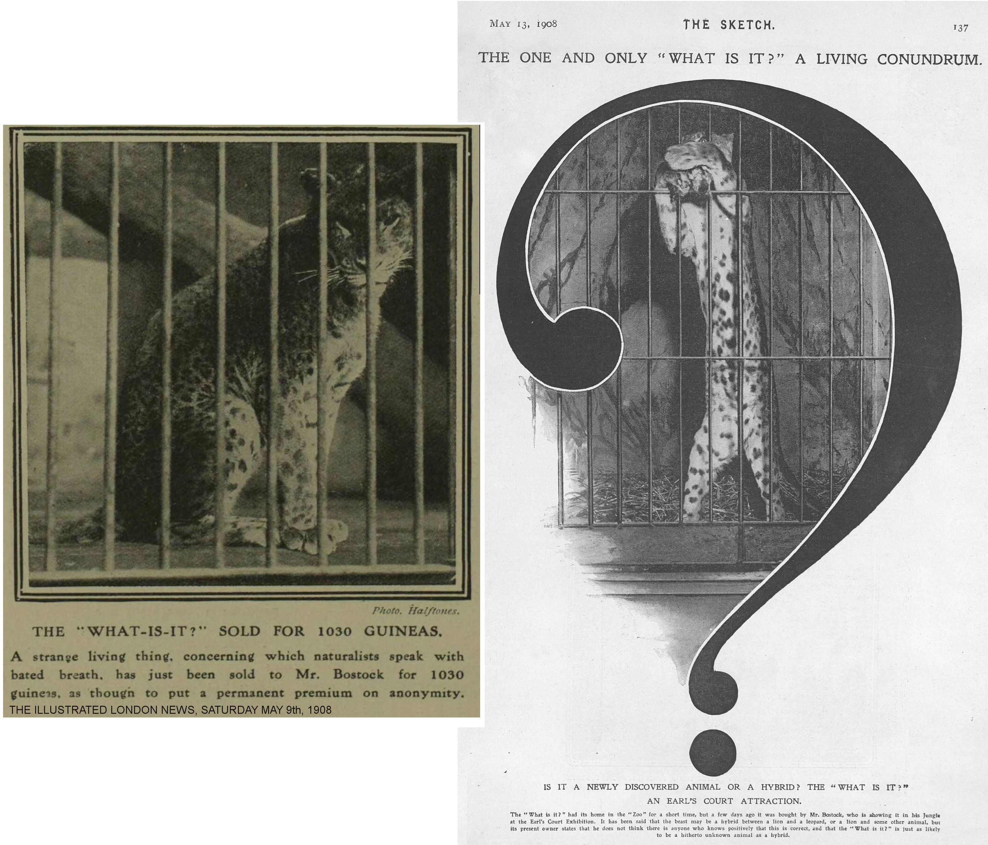 JUNGLE PUZZLE. “UNKNOWN ANIMAL” SOLD FOR 1,030 GUINEAS. (Cheltenham Chronicle, 9th May, 1908). ”What was described in the sale paper as an "unknown animal, supposed to be a hybrid lion-leopard,” was put up at auction on Saturday at Aldridge's and realised the remarkable price of £1,061 10s. (1,030 guineas). This enigma of the jungle, which is humorously styled the “What-is- It?” has been on view at the Zoological Gardens for some weeks. Experts in zoology believe that it is a hybrid, either lion-leopard or lion-cheetah. Interest was keen when this strange “lot,” reposing comfortably in a strong cage, was offered for sale at the famous repository, and there was a buzz of excitement as the auctioneer mounted the rostrum. A hundred guineas was offered, and the price rapidly rose by hundreds, fifties, tens, and fives to 750 guineas. ‘Going,’ began the auctioneer, but somebody bid another hundred, and a rival bid an additional fifty. Now, however, the rivalry was confined to two men. By fifties, and tens, and fives they bid against each other until the animal was disposed of, as already stated, for 1,030 guineas. The successful bidder proved to be Mr. Frank Bostock, who lost no time in settling the transaction and removing his prize to Earl's Court. Many well known showmen and menagerie keepers had been bidding against him, among them Mr. Fred Ginnett. ‘Lord’ George Sanger was an interested spectator. It is understood that the animal was bred in the Congo, with a lioness for dam, but there is room for doubt a« to the accuracy of this theory.”