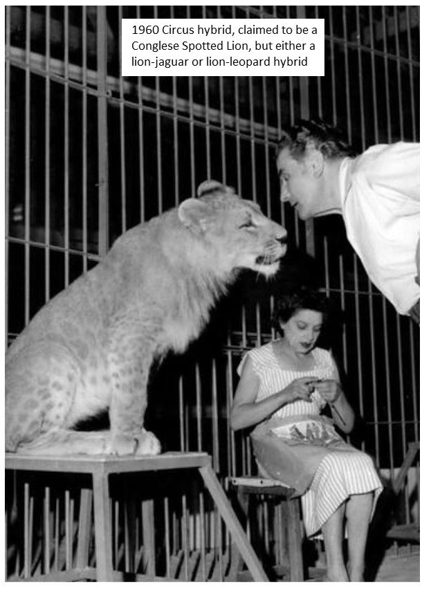 The Times (April 15, 1908) pg. 6 stated "A STRANGE ANIMAL FROM THE CONGO: Mr J.D. Hamlyn, the animal dealer of St. George-street, E,, who has just obtained two or three new monkeys from the Congo, has just received from the same region a very curious feline animal nearly as large as an adult lioness, which it resembles in build, but irregularly spotted. There is no trace of a mane or ruff, nor is the tail tufted as in the lion. The general body hue is tawny, but with a rufous tinge, reminding one of the coat of the cheetah rather than the leopard, and the inner sides of the limbs are yellowish-white, with dark spots. The markings on the upper surface differ greatly in size and character; on the hind limbs they are large; towards the forequarters and head they diminish in size, but increase greatly in number, and the face is, so to speak, stippled with black except on the nose. There is a black mark on each side of the lower jaw, and a black striped on the posterior of each ear; and along the spine, from the root of the tail to about the centre of the back is a row of dark markings, somewhat like disconnected links of a chain. The hue of the tail for the greater part of its length corresponds to that of the body, but the terminal portion is banded witg black and white. The animal, a female, is in excellent condition and fairly quiet. The obvious suggestion is that the animal is a wild-bred hybrid, with a lioness for dam and a spotted cat for sire. Lion-tiger hybrids were bred in this country in the early part of last century by Atkins, the proprietor of a famous travelling menagerie; among Continental breeders Carl Hagenbeck has been most successful. A cross between the puma and leopard has also been obtained, but wild-bred hybrids between the larger cats are exceedingly rare. To-day the animal will be sent to the Zoological Gardens, where the question of its parentage will be scientifically investigated."