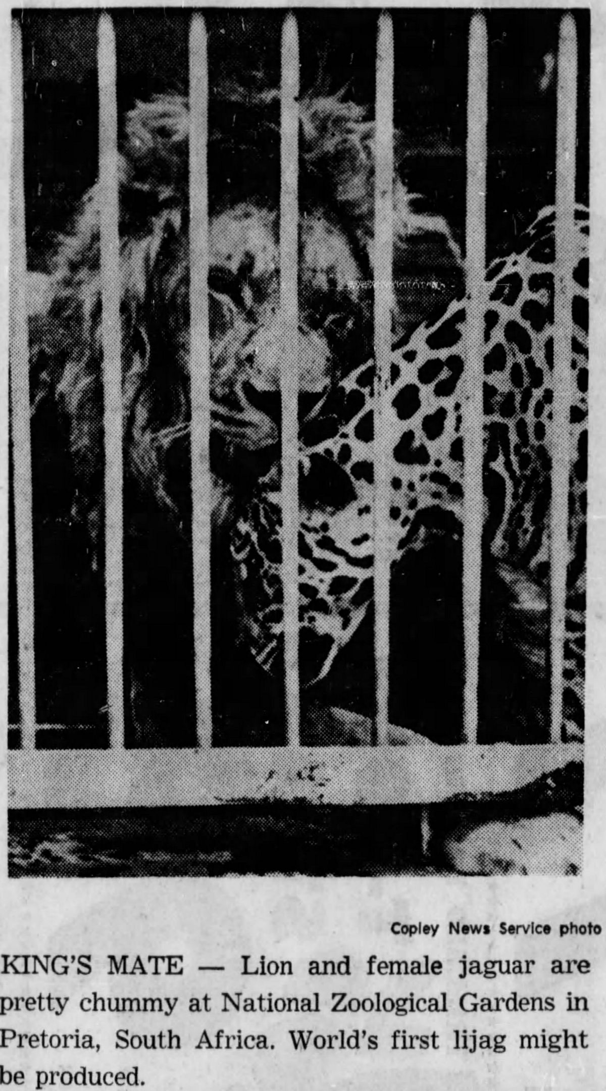 Feb 1967: First Lijag Is Possible: PRETORIA, South Africa - A love affair between an African lion and a South American jaguar might produce the world’s first lijag at the National Zoological Gardens here. Zoo director Dr. D. J. Brand, who is also a world authority on the cat family, placed the full maned lion in a cage with a jaguar and a tigress early in 1965. The lion and the jaguar have mated several times and now zoologists are hoping for results. Lions have proved good crossbreeders in the past but the nearest they have come to the present cross was 16 years ago in the United States when a lion crossed with the offspring of a mating between a leopardess and a jaguar. In 1959 and 1960 at Japan’s Hanshin Zoo a leopard mated with a lioness twice his size and produced a small, maned, spotted male “leopon. Lions have crossed with tigresses on a number of occasions producing “ligers,” anda so have tigers crossed with lionesses to produce “tigrons.” Although offsprings of such matings are usually infertile a “liger” once successfully mated with a lion and produced a female “something or another.”