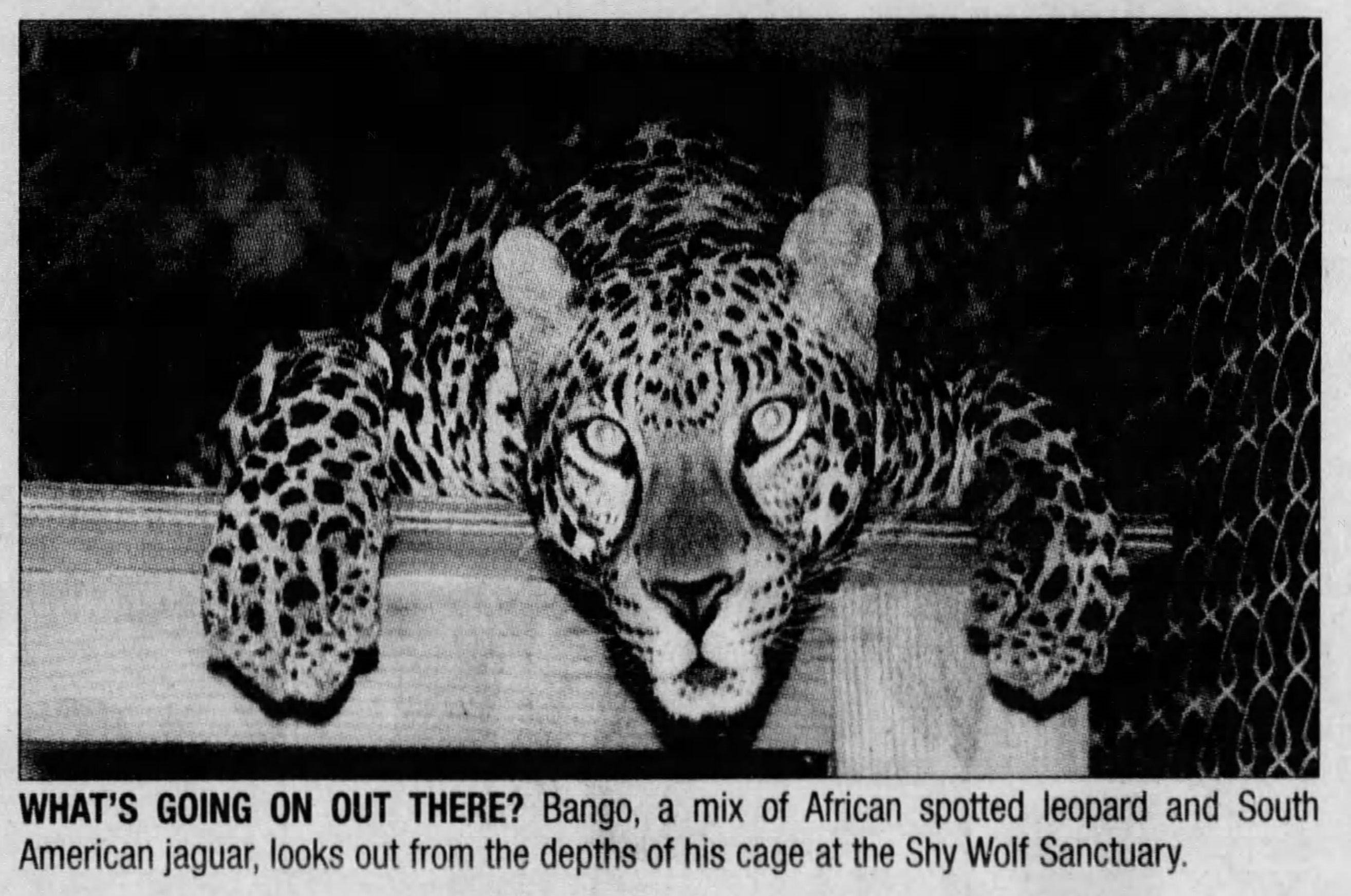 The Tipton County Tribune (Indiana), 5th August 1980 showed Jungle Larry’s wife, Nancy (“Safari Jane”) with some of the new cubs, including a lepjag. In 1969 the Tetzlaffs had bred “tiglons.” The Pittsburgh Press, 14th August 1980, pg B4 stated “On his Florida spred, his 30-member staff tends to about 200 animals, including three tiglons and a lepjag. Crosses between a tiger and al lion and a leopard and a jaguar, the tiglons and lepjag are bred to be ‘super-intelligent supercats,’ Tetzlaff says.” The Poughkeepsie Journal, 7th December 1980, pg 1C stated “Col. L.E. Tetzlaff (Jungle Larry) has managed to produce an offspring from a leopard and a jaguar, which he calls a ‘lepjag.”