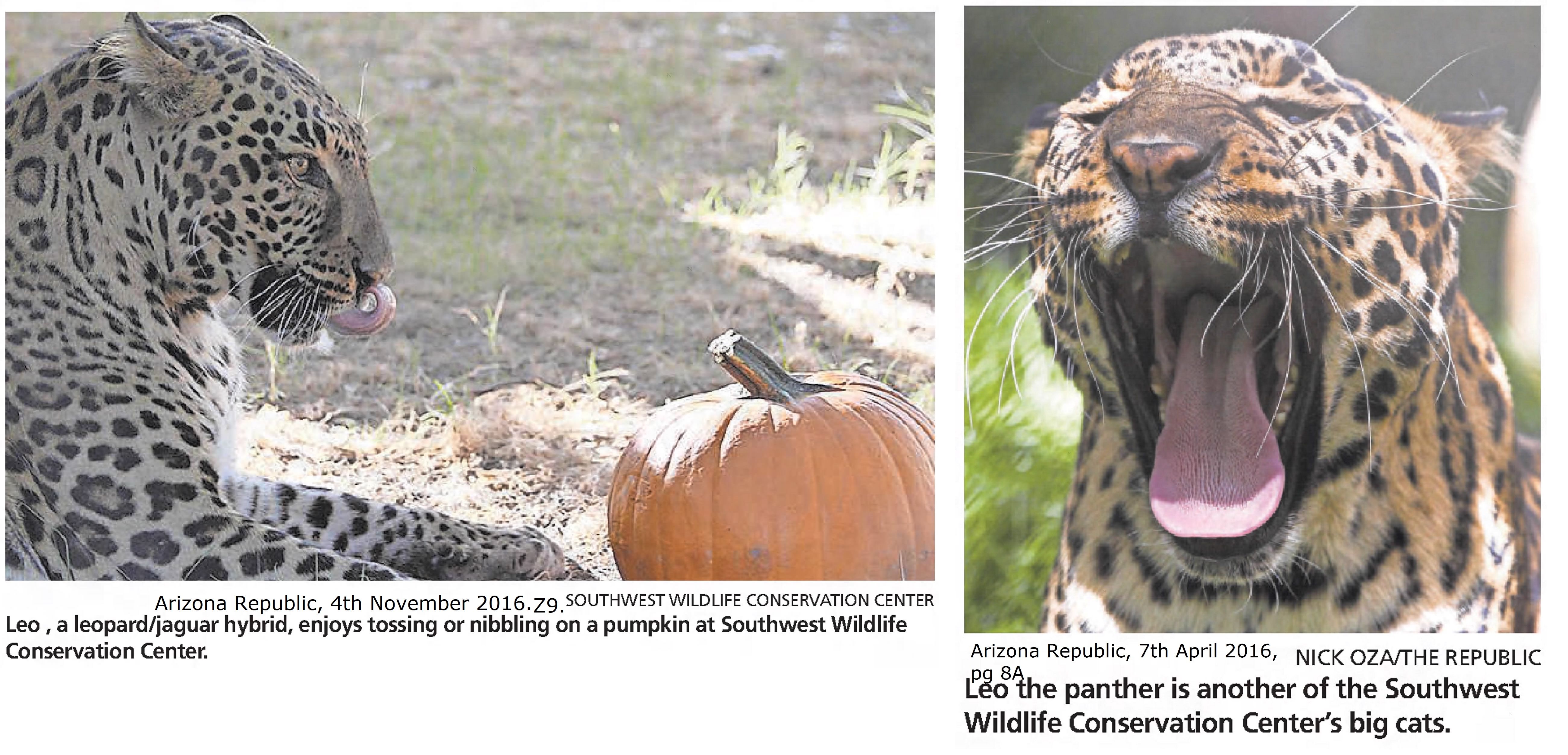 LEONARDO (LEO) the jaguar-leopard cross was bred (2002) in Las Vegas for the entertainment industry and spent his first two years in a Las Vegas show (Southwest Wildlife Center confirmed by email that he did not come from Siegfried and Roy; it is possible he belonged to Dirk Arthur who had a white tiger named Saber, also declawed and with teeth filed down, which went to the Carolina Tiger Rescue). He combined the pattern and powerful size of the jaguar with the head of the leopard. He was declawed on all four paws and defanged to make him safer for his handlers and the audience. Defanging caused him difficulty eating, while the declawing left his feet painful and made walking difficult. After 2 years his owners sold him to a small pet store and zoo in Douglas, Arizona where he spent seven years in a barren 10 x 12-foot enclosure as a curiosity for tourists. He was teased by tourists, neglected by his owners and survived on a very inadequate diet, but because the zoo was registered he could not be confiscated despite substandard accommodation and care. When the zoo fell on hard times, Leonardo was taken by Southwest Wildlife Center. He had a collapsed lung, severe pneumonia and was near death due to neglect and slow starvation. At first, he was scared and angry due to being tormented by humans, but with continuous medical care, a grassy enclosure with ramps, platforms, hiding places and toys and regular treats and positive reinforcement from keepers he became a happy, friendly and playful cat. He was described as a “confirmed bachelor” (male F1 hybrids are sterile, it isn’t mentioned if he was castrated). In 2017 he celebrated his 15th birthday, which is about the average lifespan of leopards and jaguars. By 2019, declining health – exacerbated by years of neglect and incorrect diet - meant failing kidneys and weight loss and he was euthanised.