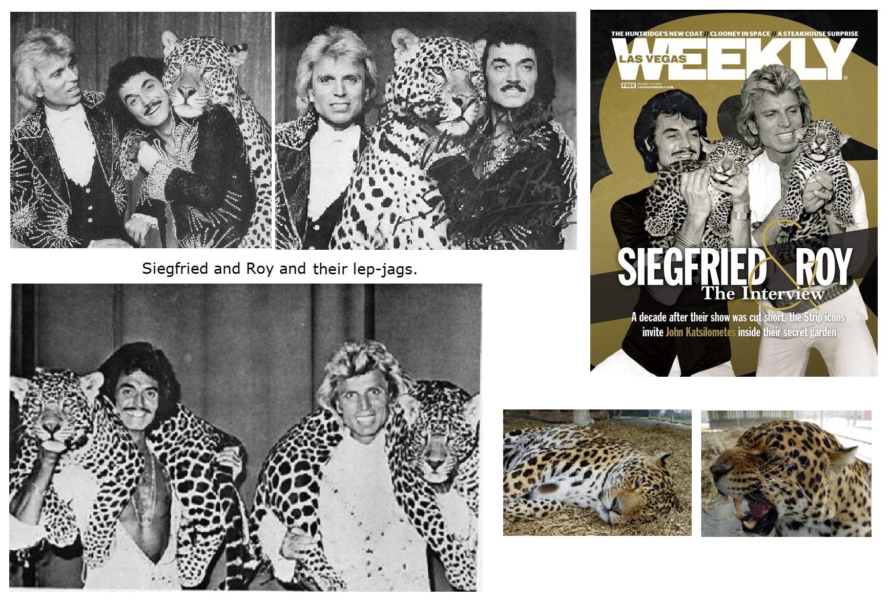 Siegfried and Roy had two spotted lepjags, Ali and Chico, and a black lepjag Sabaka, in their show in the 1990's, and listed them as lepjags in the show's 1994 program. However, in the 1998 souvenir program, they were listed as jaguars. In the book, "Siegfried and Roy - Mastering the Impossible" a photo on page 132 shows Siegfried and Roy in the pool with Ali who is identified on that page as being a lepjag. There is also a picture on page 260 of Siegfried and Roy with one of the lepjags in the show. They used them in the illusion where Roy (or rather a double) and a lepjag were shot out of a cannon; the second spotted lepjag was used to create the illusion. Kevin Chambers saw that show, and could tell right away that the animal that placed in the cannon was not the same as the one on the other side of the stage (where they had been shot to).
