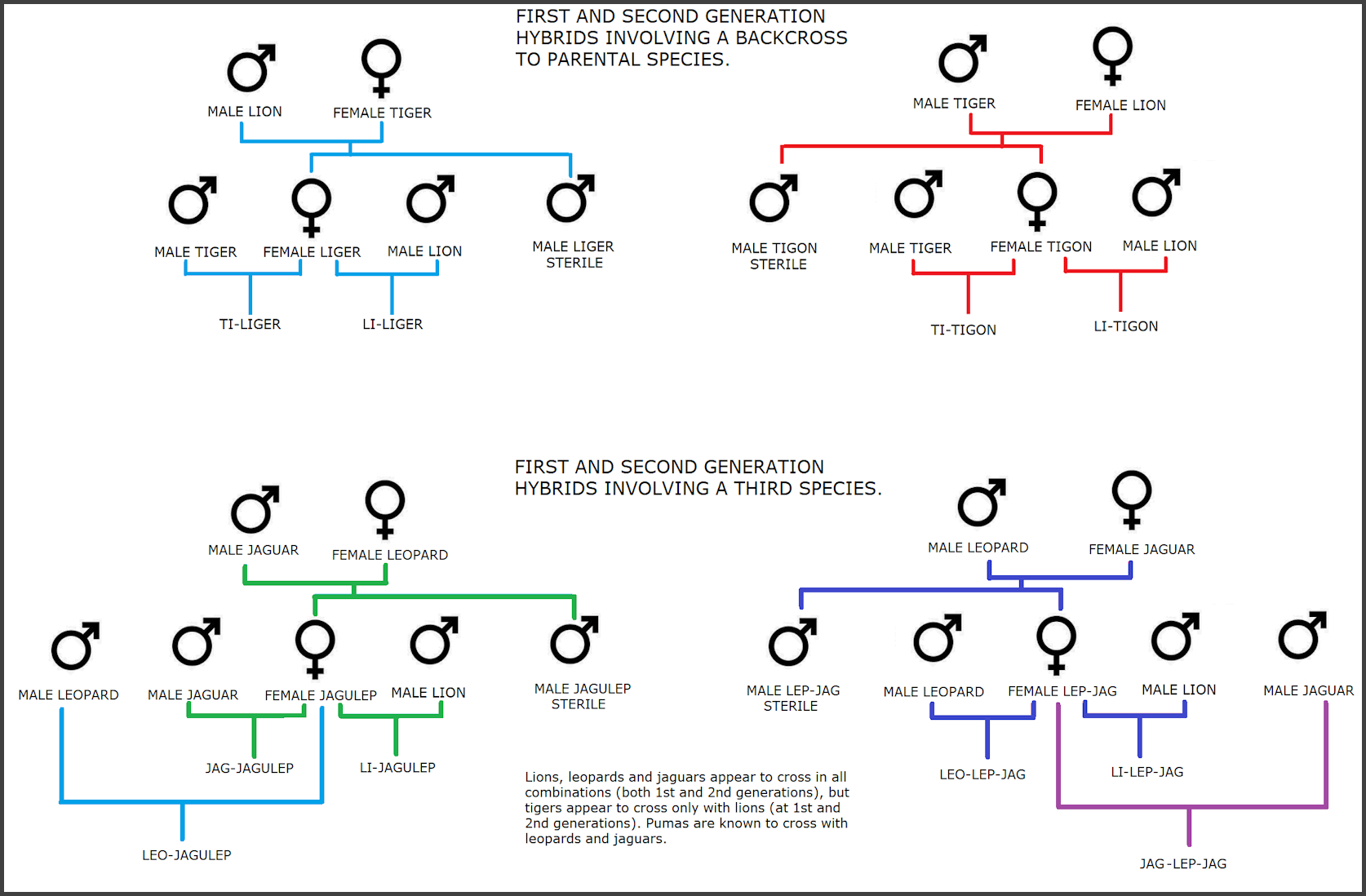 Male hybrids are rarely, if ever, fertile even if they do display sexual behaviour. To date, all male ligers, tigons, ti-tigons and li-tigons investigated have apparently proven sterile. There are no authenticated liger x tigon, liger x liger or tigon x tigon hybrids. Theoretical offspring could be lion-like, tiger-like, liger-like or tigon-like, depending on what combination of genes they inherited. It is more likely that anecdotally reported offspring from supposed hybrid-to-hybrid matings actually resulted from unobserved additional matings of a hybrid female with a pure-bred lion or tiger.