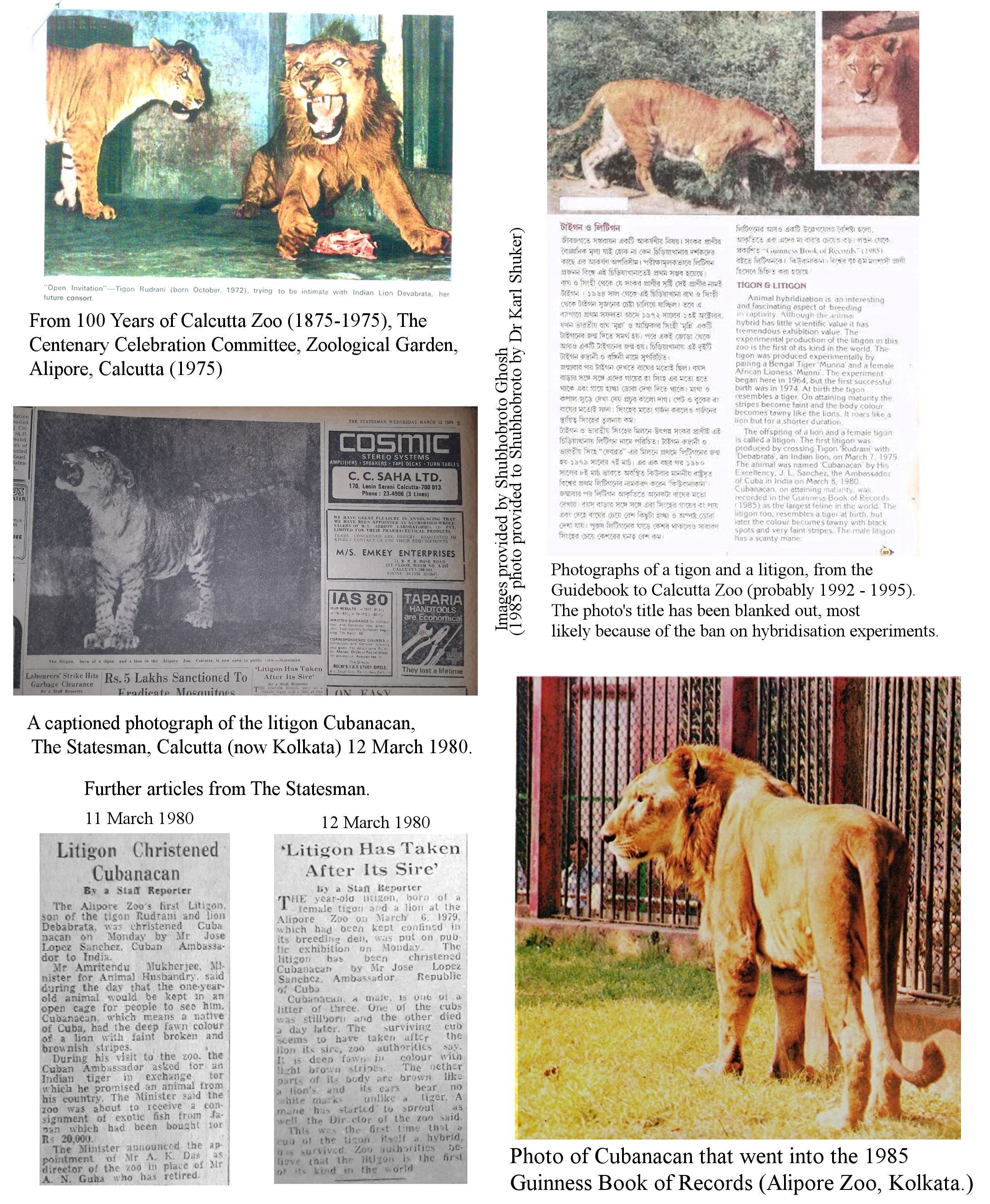 In 2017, Shubhobroto Ghosh (of World Animal Protection in India, New Delhi, India), contacted me with information and photos about a hitherto forgotten litigon The litigon rediscovered . A photo of this animal had been found in the Guinness Book of Records 1985 by Dr Karl Shuker. Earlier, in July 2016, while scouring through the archives of the National Library in Kolkata, India, Payel Biswas, Librarian at the Institute of Urban Transport (India), New Delhi and Subhodip Bid of the National Library, Kolkata found a report Litigon has taken after its sire in The Statesman newspaper of 12th March (1980). It included a photograph of a male litigon. The report described this as a hybrid of a male Asiatic lion a female tigon (hybrid of a male tiger and a female African lion) bred at the Alipore Zoological Gardens in Calcutta (now Kolkata). The litigon was named Cubanacan by Jose Lopez Sanchez, the then Cuban Ambassador to India, and was photographed on its first public appearance. Until the rediscovery of the news report, this second-generation hybrid seems to have been forgotten.