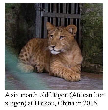 On 18 January 2017, two litigon cubs went on public display at a safari zoo in Haikou, China. Their mother was a tigon and the father was an African lion.