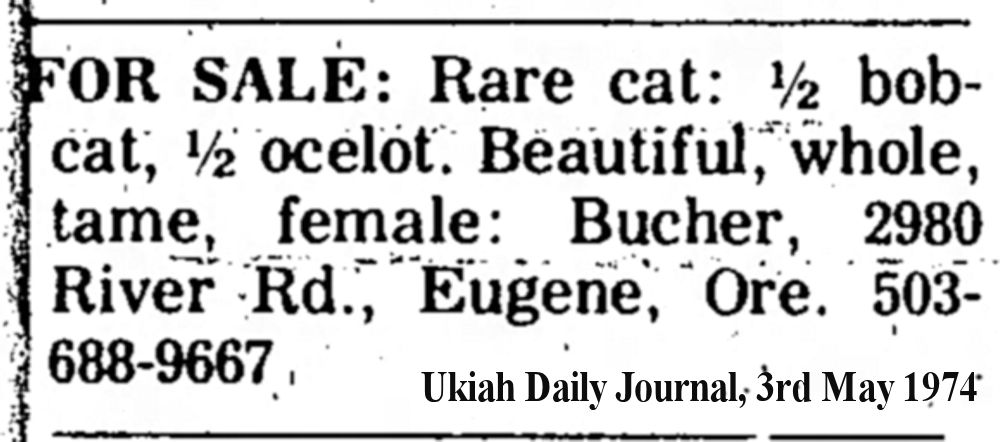 An advert appeared in the Long Island Ocelot Club Newsletter Nov/Dec for 1969 saying: "Ocebob, bobelot or whatever you choose to call them, they are with us and AVAILABLE ! Gertrude Troop [Troop's Pet Shop, Bruni, Texas] advises that she has had and will have from time to time, ocelot x bobcat kittens bred from her Mexican Ocelot and a Texas bobcat. Both parents are about four years old. Ocebob kittens sell for $200 each." Gertrude Troop appears to be the source of the ocebobs mentioned in the newsletters.