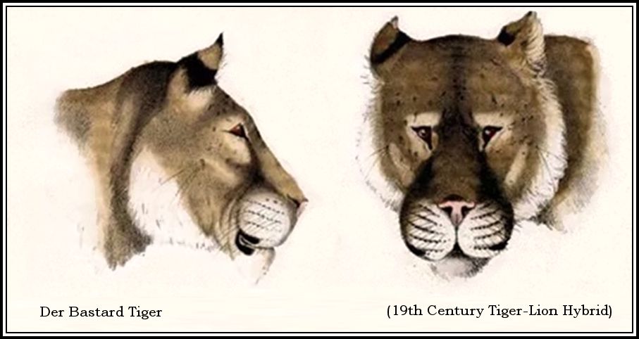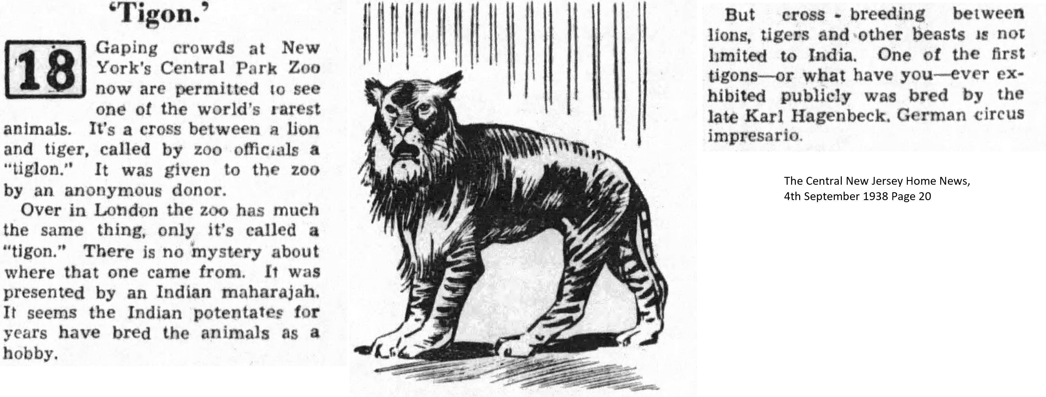 TIGON. The Central New Jersey Home News, 4th September 1938. Gaping crowds at New York s Central Park Zoo now are permitted to see one of the world s rarest animals. It s a cross between a lion and tiger, called by zoo officials a tiglon. It was given to the zoo by an anonymous donor. Over in London the zoo has much the same thing, only it s called a tigon. There is no mystery about where that one came from. It was presented by an Indian maharajah. It seems the Indian potentates for years have bred the animals as a hobby. But cross-breeding between lions, tigers and other beasts is not limited to India. One of the first tigons or what have you ever exhibited publicly was bred was bred by the late Karl Hagenbeck, German circus impresario.