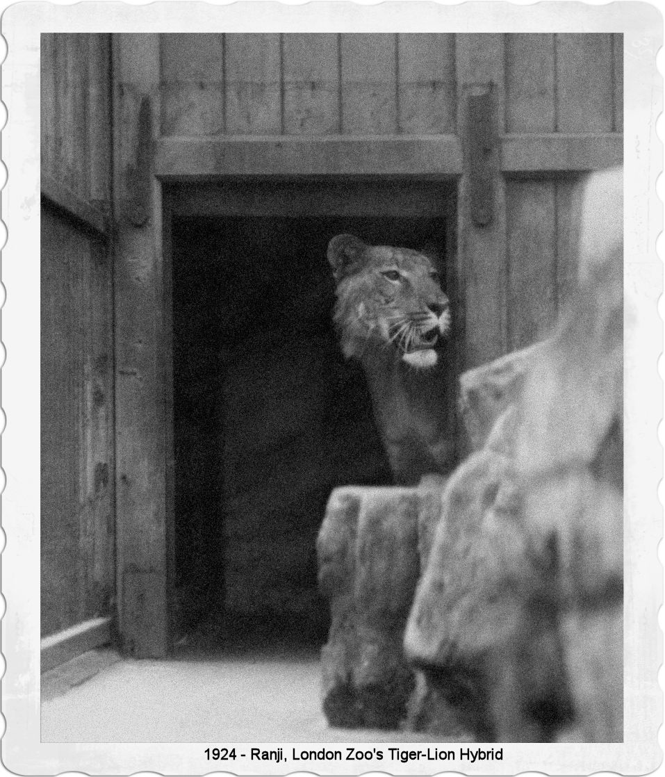 THE ZOO LOSES ITS "TIGON" - News Chronicle, 7th January, 1932: The Zoo lost yesterday one of its finest and most uncommon animals, the "Tigon" (as the Tiger-Lion Hybrid was called), which was found dead in its cage in the Lion House. "Ranji," who was labelled with that name in recognition of the fact that he was presented to the Zoo by the Jam Sahib of Nawanagar (better known in Britain as Prince Ranjitsinhji, the cricketer), was the offspring of a tiger and lioness who lived in the Prince's private menagerie in India. While the tigon was a cub its father and mother had one fight - and each inflicted fatal injuries on the other. The tigon reached the Zoo in 1924. He was an object of keen interest to all the scientists - zoologists, biologists, doctors and others - who visited the Zoo. Americans were particularly interested in him as a curiosity which was rarely to be found in any zoo. This queer looking beast grew up to be a fine animal, the biggest creature in the Lion House. His fur was short and his skin of the colour of a lion; but his head, with its longer fur, was of the shape of a tiger's, and his purring had the staccato notes of the tiger's purr. "Shadow" stripes also were visible on his skin. Altogether, he was rather more tiger than lion, except in colour. The post-mortem will reveal the cause of his death, which was sudden.