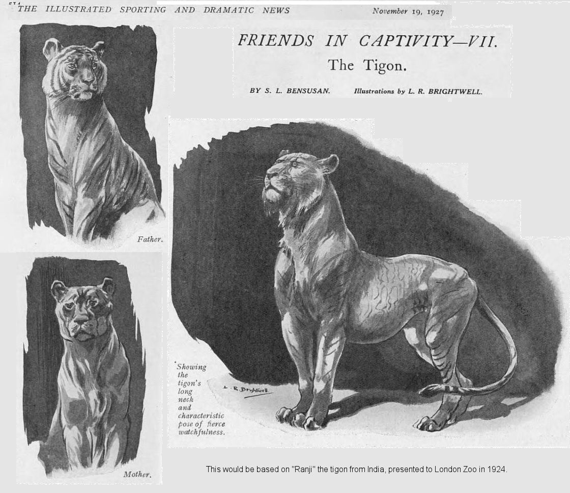 The Illustrated Sporting and Dramatic News, 19th November, 1927, carried a long article on London Zoo tigon: FRIENDS IN CAPTIVITY-- VII. The Tigon. BY S. L. BENSUSAN. Illustrations by L.R. Brightwell. This week Mr. Bensusan writes of the Tigon at the Zoo, that aloof offspring of a tiger and a lioness, who shows but little of the tendency of the species from which he springs to respond to his captor's advances.