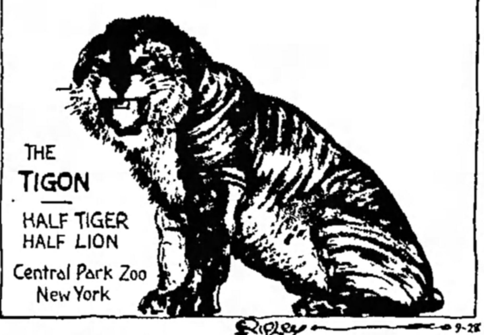 In 1938, a tigon was exhibited at Central Park Zoo. This was reported by several papers: A liger or tigon or lioger or tilion or well, an odd-looking beast, aged 4, with a puzzled look on its face and a glint in its eye romped in solitude Saturday in a cage in Central Park (NY). Where he came from only the directors of the zoo knew. The donor, they said preferred to ream anonymous and they were not going to let the cat out of the bag One thing was made public - papa was a Siberian tiger; mama was an African lioness, and the offspring rare, resembling a lion save for its head. But New York s surprise is still to come: In winter when the pelt is in its prime the stripes appear. And also THE TIGON. One of nature's strangest hybrids, a 4 year old cub of an African lioness and a Siberian tiger, is the latest resident of the Central park zoo in New York City. The animal, known as a tigon, resembles a lion with the exception of the head, but its ears are striped like a tiger's, and in winter time, when the pelt is in its prime, the body shows the tiger s stripes. The animal had been bred in the Hamburg, Germany, zoo, and is the gift of an anonymou- donor. The head keeper of the zoo explains that when the tigon resembles a lion more than it does a tiger it is known as a liger.