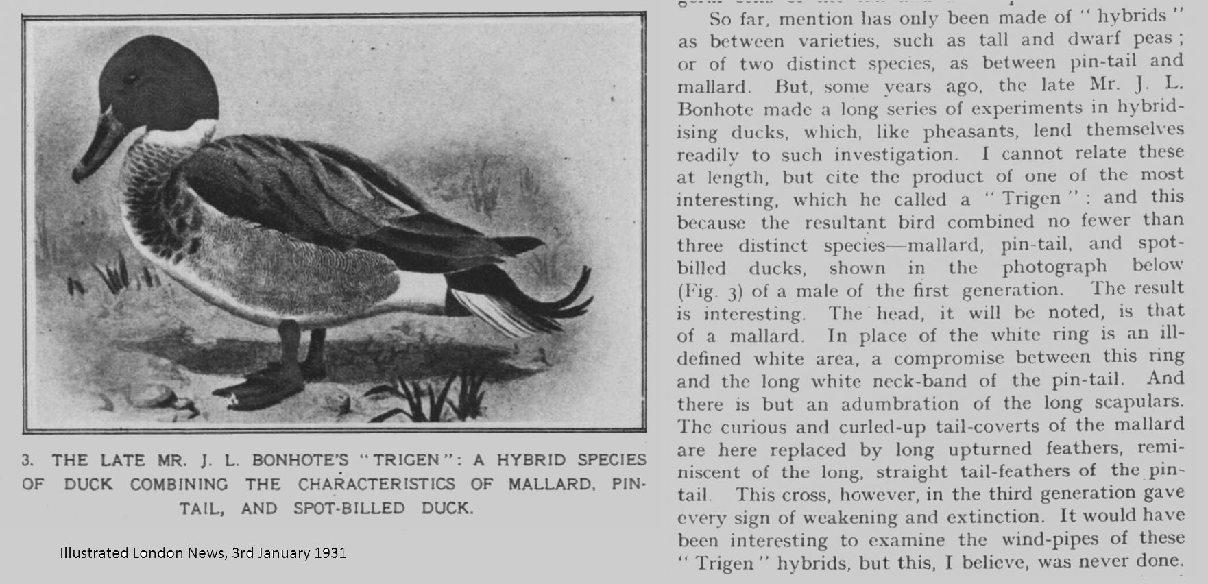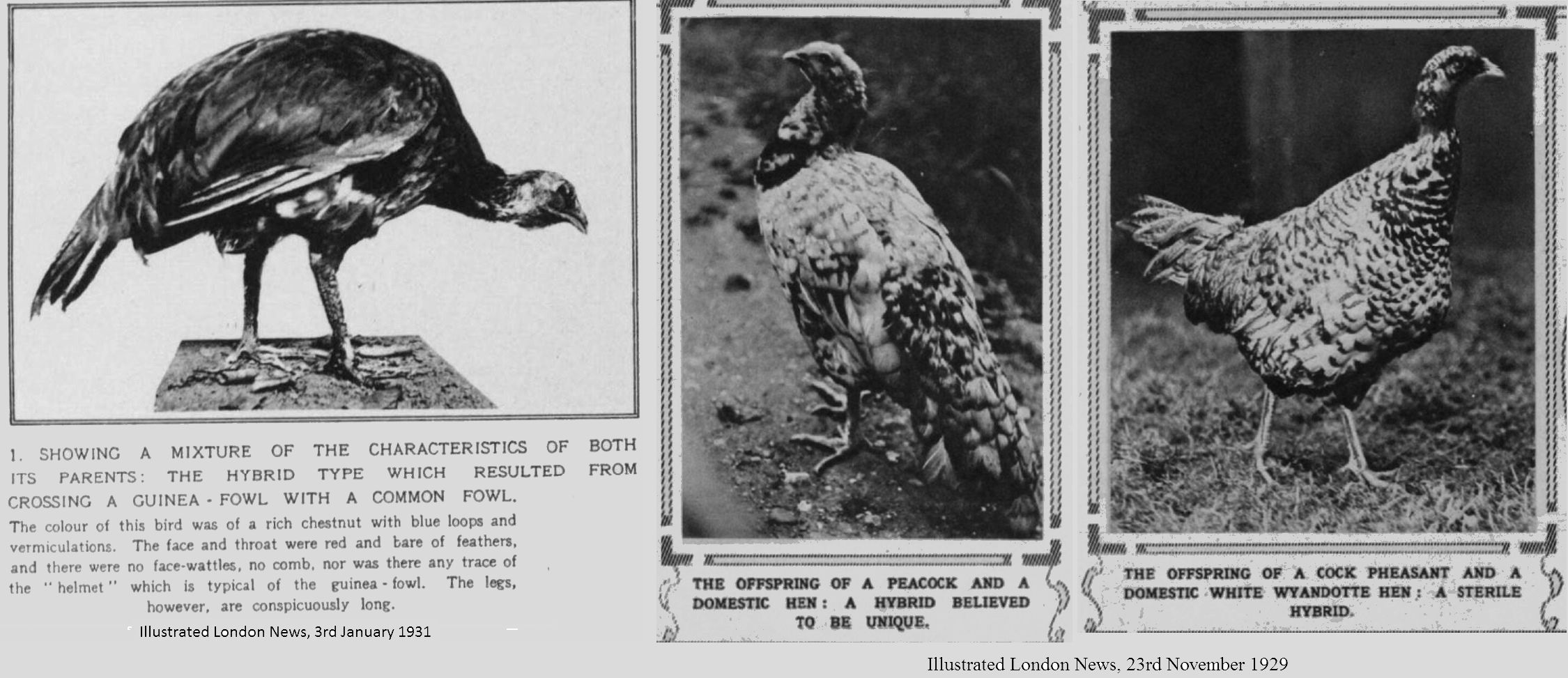 The Illustrated London News, 19th December 1953, gives this account of poultry hybrids: An outstanding example of hybridisation is given by Krick, writing in the Bull. Acad. Malgache for 1942-43. He mentions a hybrid from a domestic cock and a guinea-fowl. It is of especial interest because of the incongruity of the parents and also for the detailed account of the offspring. This hybrid was black when first hatched, but became progressively white. It had the head of a cock, but was without comb or wattles. The lateral caruncles, well developed in the guinea-fowl, were only faintly outlined. There was a well-marked bib under the beak and the upper neck, and the nostrils were surrounded by a reddish-brown skin. The body was long, as in the guinea-fowl, but there was long tail that continued the line of the body backwards. The feet were black, with light patches, and they carried no spurs. Occasionally reddish-brown feathers appeared in the plumage, and the call was more nearly that of a guinea-fowl. In other words, the characters of the parents, the one belonging to the genus Gallus and the other to the genus Numidea, were fairly evenly divided in the offspring. The last interesting point mentioned by Krick was that this hybrid lived amicably with guinea-fowl but showed marked hostility to domestic poultry.