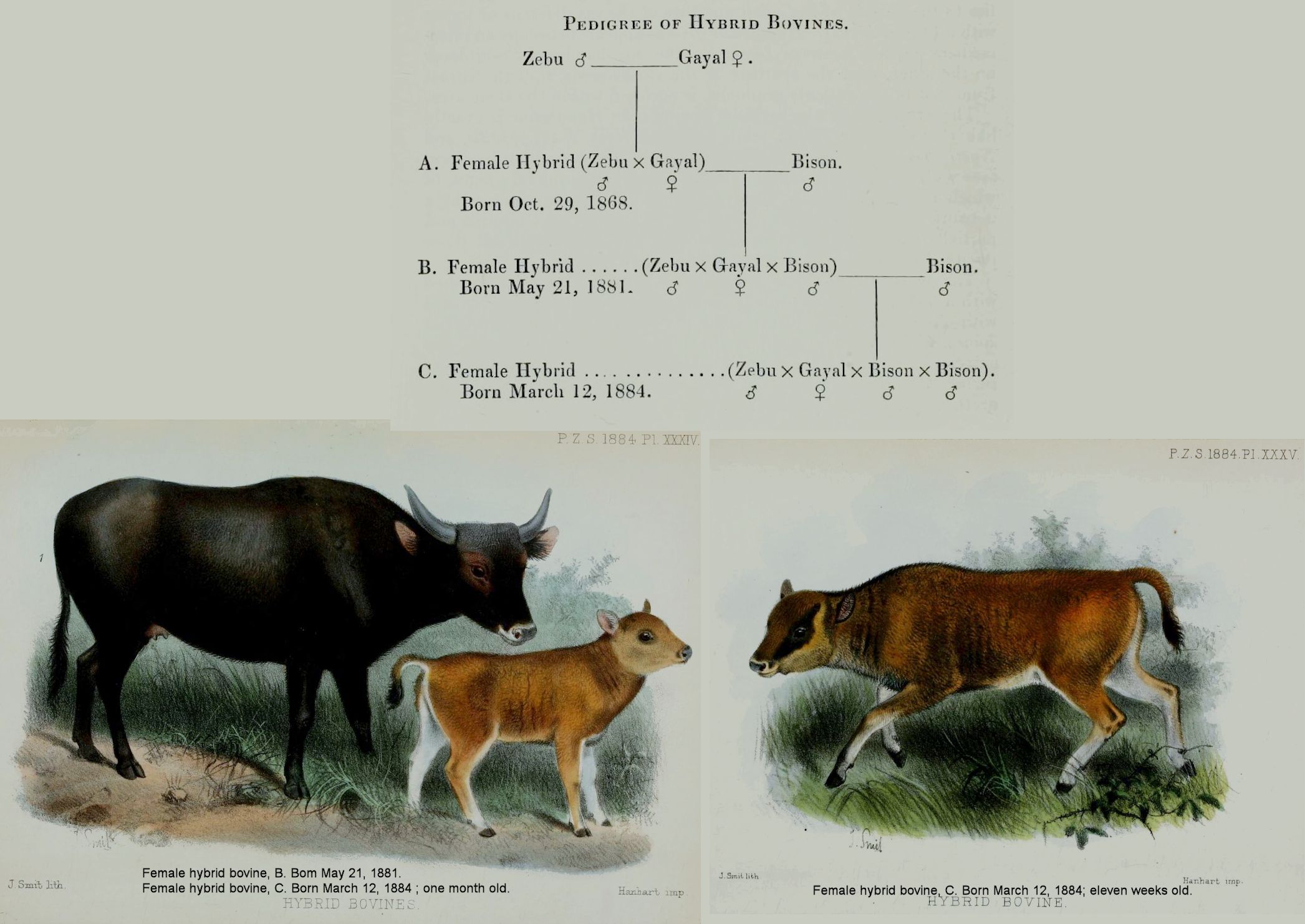 It will be seen that this animal (B) is the produce not only by the intermixture of three well-marked species, but, according to our present definition, of three distinct genera. This remarkable animal, the result of the triple alliance (Plate XXXIV.), was last year introduced to the bull Bison, and on the 12th of March, 1884, she produced a female (C of pedigree). This last individual, now eleven weeks old (Plate XXXV.), is undistinguishable from a pure-bred Bison of the same age. Having placed before you the facts of the wonderful fertility of this hybrid race, and the remarkable display of what I think may be called the plastic properties that are capable of producing by artificial selection a variety of races, I think I may venture to say that the hybrid Gayal and Zebu would have bred with any true bovine animal.