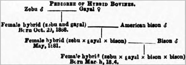 (BOVINE HYBRIDS.) London Daily News, 24th April 1886. Zoological students should not fail to notice the hybrid bovine animals bred in the Gardens by Mr. A. D. Bartlett, the indefatigable superintendent, A female hybrid has been produced not only by the intermixture of three well-marked species (zebu, gayul, and bison), but according to present definitions three distinct genera. Mr. Bartlett has long had a theory that some of the domestic animals, for the origin of which there has been no definite explanation, have resulted from a mixture of species, and he has certainly upset the long-established dogma that it was impossible to breed from a hybrid.