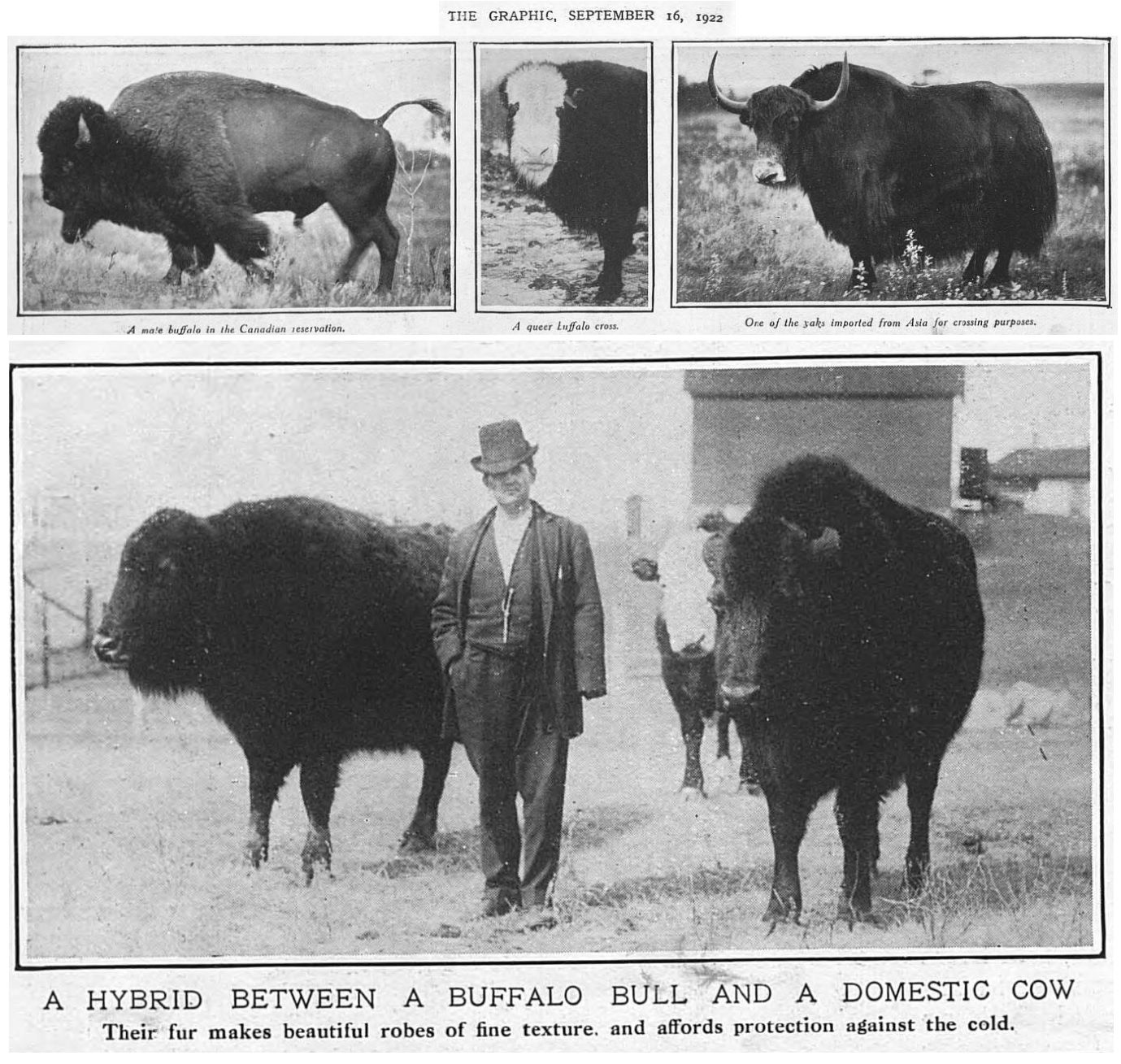 From The Royal Natural History, edited by Richard Lydekker and published 1894: In captivity the America bison breeds freely, not only with its own kind, but with other species of cattle. In the United States a herd has been established by crossing bull bison with domestic cows; the cow bison not producing a hybrid offspring. This hybrid race is perfectly fertile, either with itself or when again crossed with domestic cattle; and it is considered that a strain of bison blood will lead to the cattle in the North-Western States being better enabled to withstand the blizzards of those districts.