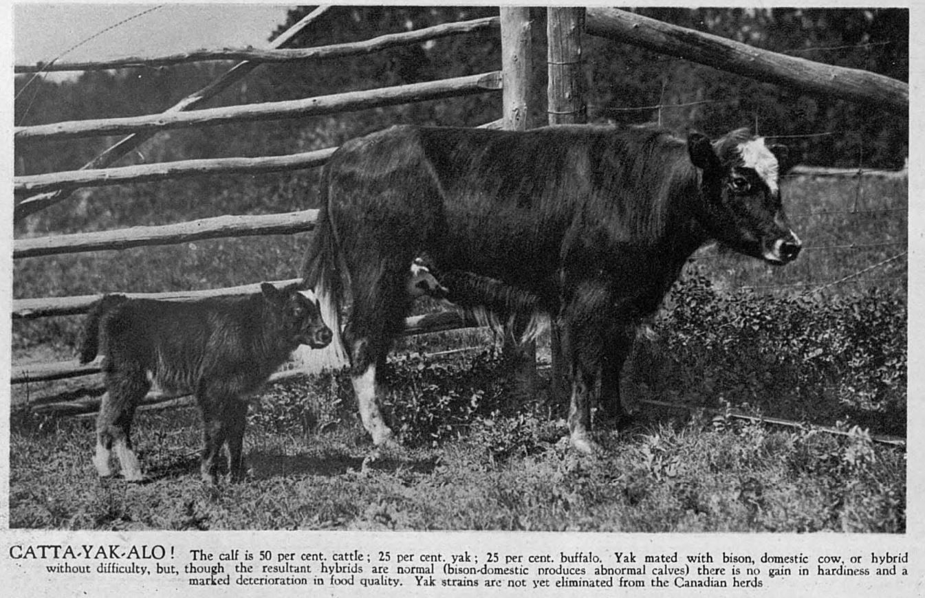 THE galyak is the serious effort of the Canadian breeders, but they have also tried a cross between the yak and the bison. Only one of these hybrids has ever been produced, and it is certainly a most strange creature. In body outline it is intermediate between bison and yak. It wears its coat thick all over, yak fashion, instead of heavy in front and thin behind, like a bison. What it may be like in temperament must be a puzzle to its keepers; for the bison is an unstable, stampedable animal, while the yak wouldn’t go faster than three miles an hour if you built a fire under it. But whatever may be the use or interest of this yakson or bi-yak, whichever you may choose to call it, certainly its zoological cousin, the galyak gives promise of being un animal of real value on the northern Canadian range.