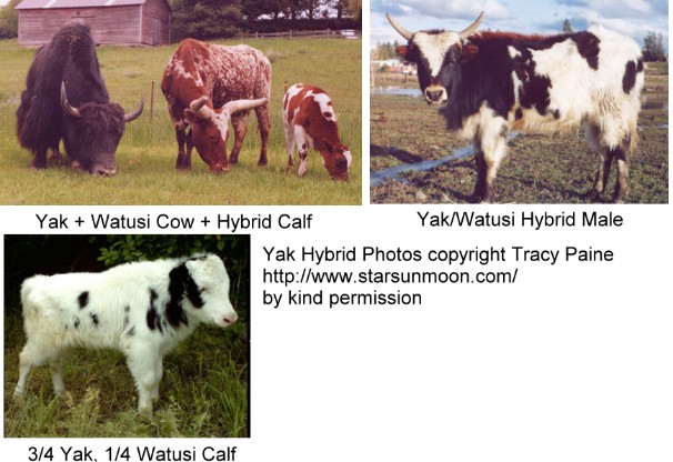 Other crosses of Yak × European Domestic cattle were called “yakows”. The females were fertile (some males may be poorly fertile) and introgressive hybrids were formed with each of the parent species meaning that low levels of yak gene may be present in some domestic cattle and vice versa in regions where these hybrids are routinely bred.