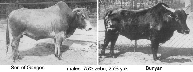 Yak x zebu crosses were also described by Zawadowsky in" Zebu-Yak Hybrids: Sterility of Bull, Fertility of Cows" Journal of Heredity.1931; 22: 297-313. The cross was described as between genera (they are now all considered to be species in the genus Bos). In the first cross, the females are fertile, but the males are sterile. Females were backcrossed to pure zebu bulls resulting in a second generation (2 males shown below). According to Zawadowsky, some traits appeared to be inherited in clusters.