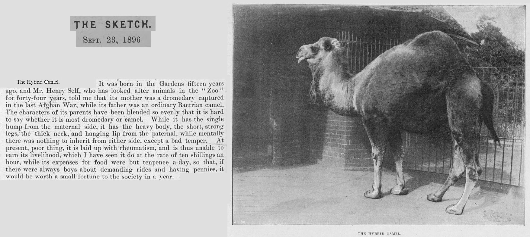 Back in a more credulous age, unfamiliar animals were often billed as hybrids. In this case, a black Dromedary camel was billed as a missing link between the Asian and South American camels. One report calls it a “black hybrid.” In fact it is a colour morph, but its story is worth repeating.