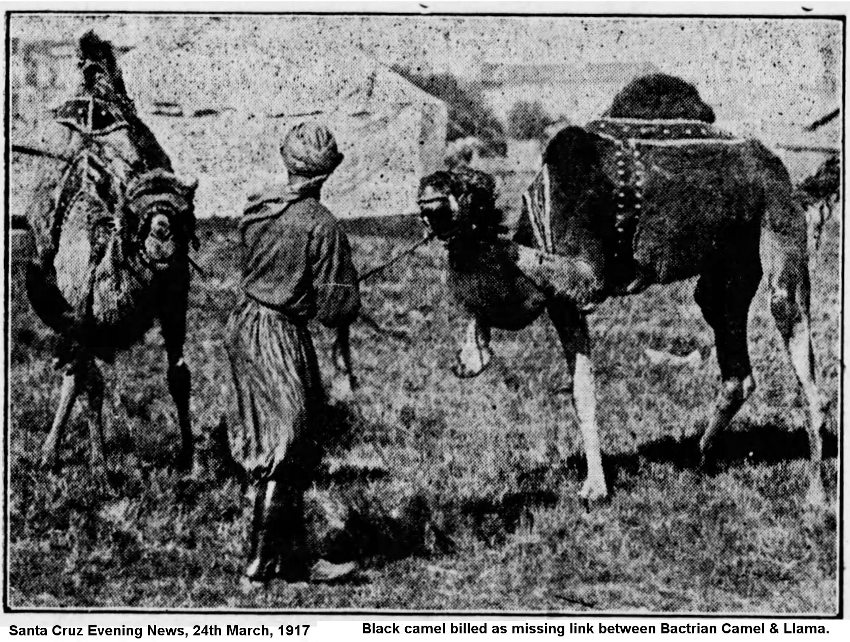 CURIOUS BLACK CAMEL FORMS ATTRACTION OF BARNES’ CIRCUS, TO BE IN SANTA CRUZ MONDAY (Santa Cruz Evening News, 24th March, 1917). Holy Moses, a curious black camel from the strange, sunbaked desert in the vicinity of Mecca, is one of the star attractions of the Al. G. Barnes four-ring wild animal circus which will give two performances in Santa Cruz Monday. The capture and presenting to the public of this unusual attraction makes a good story. A party of hunters, who are ever seeking new features for this mammoth animal circus, J. A. Callahan, and others, traveled past the city of Mecca and, while encamped at an oasis one night, were awakened by the arrival or an Arab priest. The priest, who was riding a black camel, asked the hunters to give him refuge. [. . .] Captain Callahan, seeing the value the priest and black camel would be to the Barnes circus [. . .] brought the Mohamet priest, with Holy Moses, the black camel, to America and they are now with the circus. [. . .] the sight of the black camel clears up a long supposed belief that the black camel was totally extinct, though once believed to be the mother of all camels.