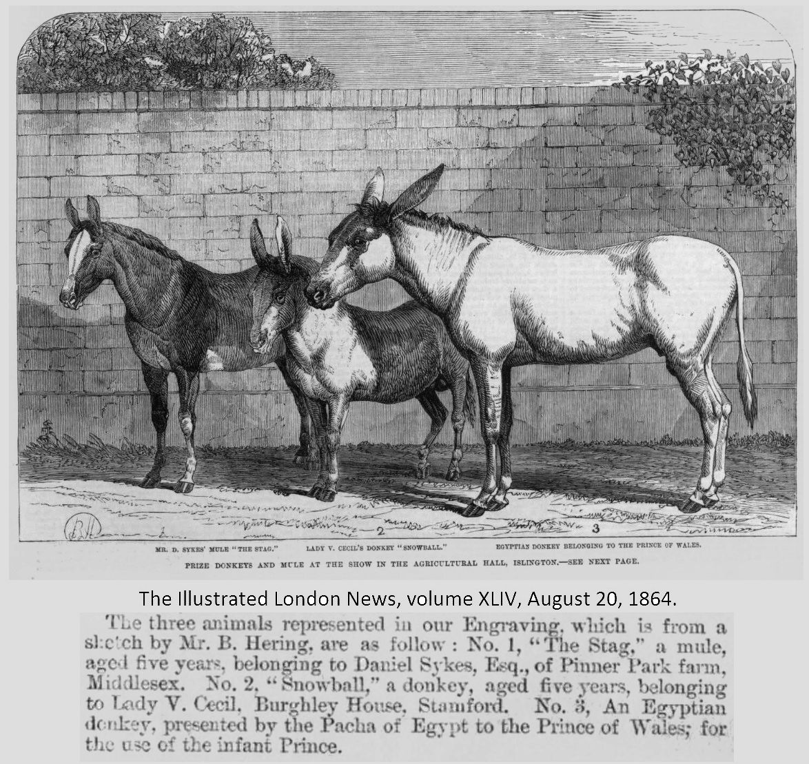 The Democratic Advocate, Westminster, Maryland, 1st June 1871, page 1.The Hinny is the offspring of the Stallion and the Jennett, or she Ass, and is a very different and inferior animals to the Mule, which is the offspring of the Mare and Jack. Both are incapable of propagation, being hybrids. The Mule is fond of the horse, and will follow wherever the horse leads, hence there is no trouble in conducting droves of them, if a man rides before them on a horse. The Hinny does not manifest this peculiarity. It is a less sprightly and less serviceable animal, and does not seem to be as proud of its kinsman, the horse, as the Mule is.