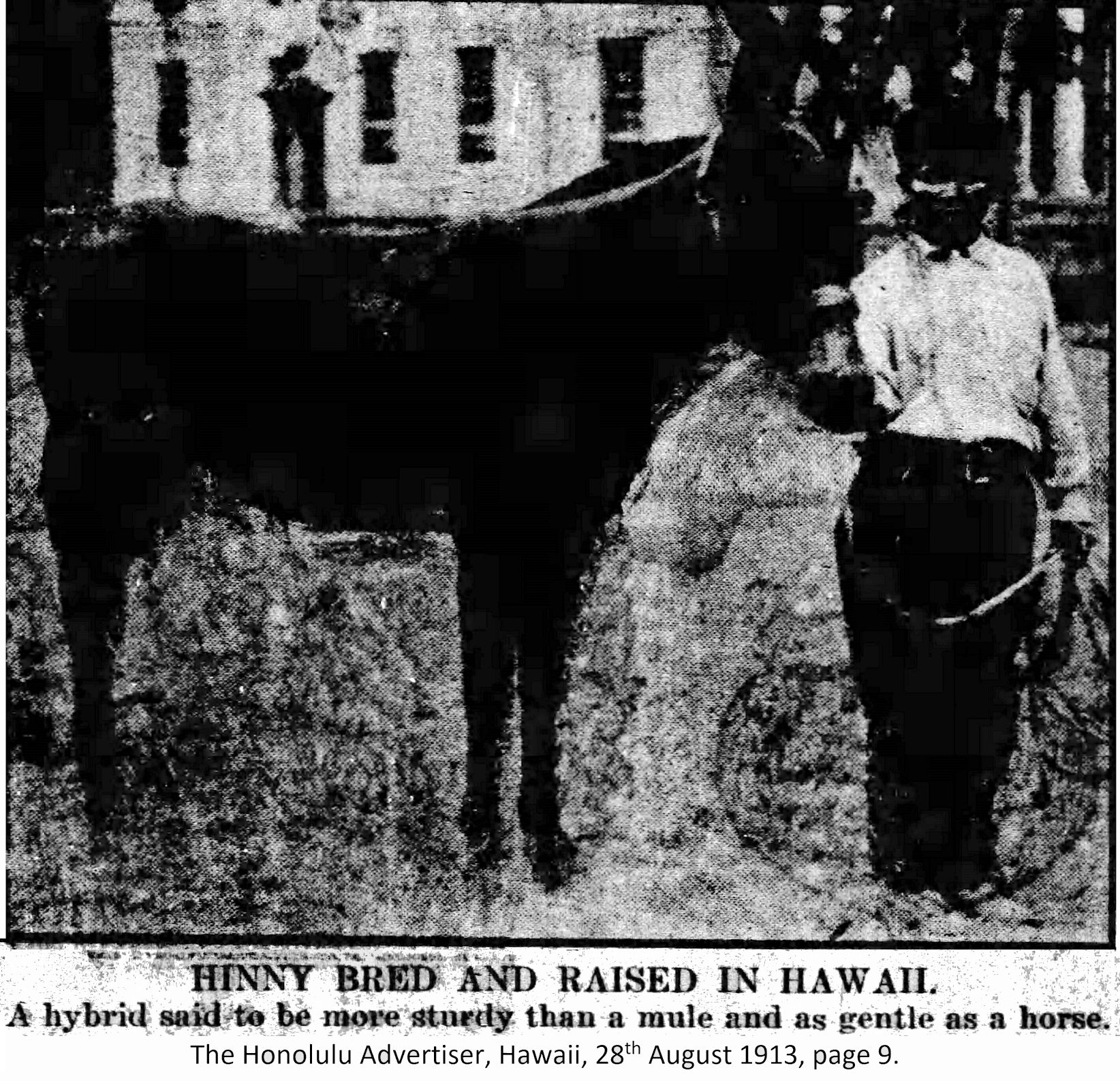 Manager Monsarrat, in a letter to E.A.R. Ros, of C. Brewer & Co., relative to the hinnies gives their genealogy as follows: "These are the only hinnies ever bred on the Islands. They were sired by a son of 'The Mallard,' and you know what he was, one of the best thoroughbred stallions ever imported to these Islands. Today we are using the sire on cattle and he is one of the best we have, chock full of grit and endurance. Blood will tell, an these hinnies have the thoroughbred in them. The brown stands 13.1-and-a-half hands, and the buckskin 13.1 hands, the latter being splendidly matched in every way. I should judge each weighs about 750 pounds. They are so gentle under saddle, that there should be no trouble to break them to harness, provided they are handled by a man who will not abuse them in the breaking, for they are timid, but of a fine disposition. After having run out a whole year, they were taken up, a saddle thrown on them, and not one of them showed a buck, or any signs of temper. Can you beat this with your scrub Hawaiian mule? You were here and can corroborate what I say as to their gentleness. They have got their brother hybrid, the mule, backed off the earth, in this respect.