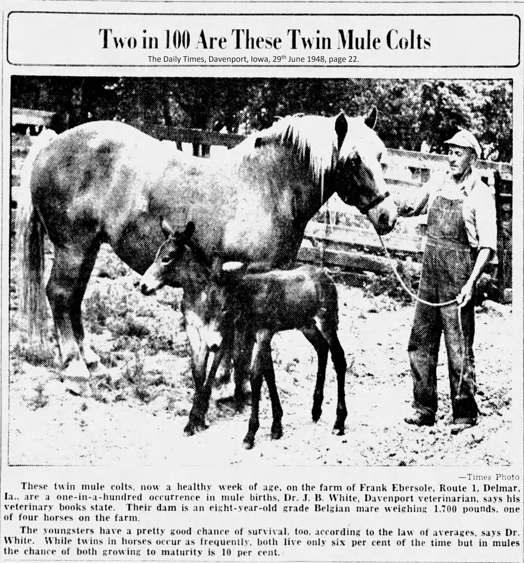 TWO IN 100 ARE THESE TWIN MULE COLTS. The Daily Times, Davenport, Iowa, 29th June 1948, page 22.
