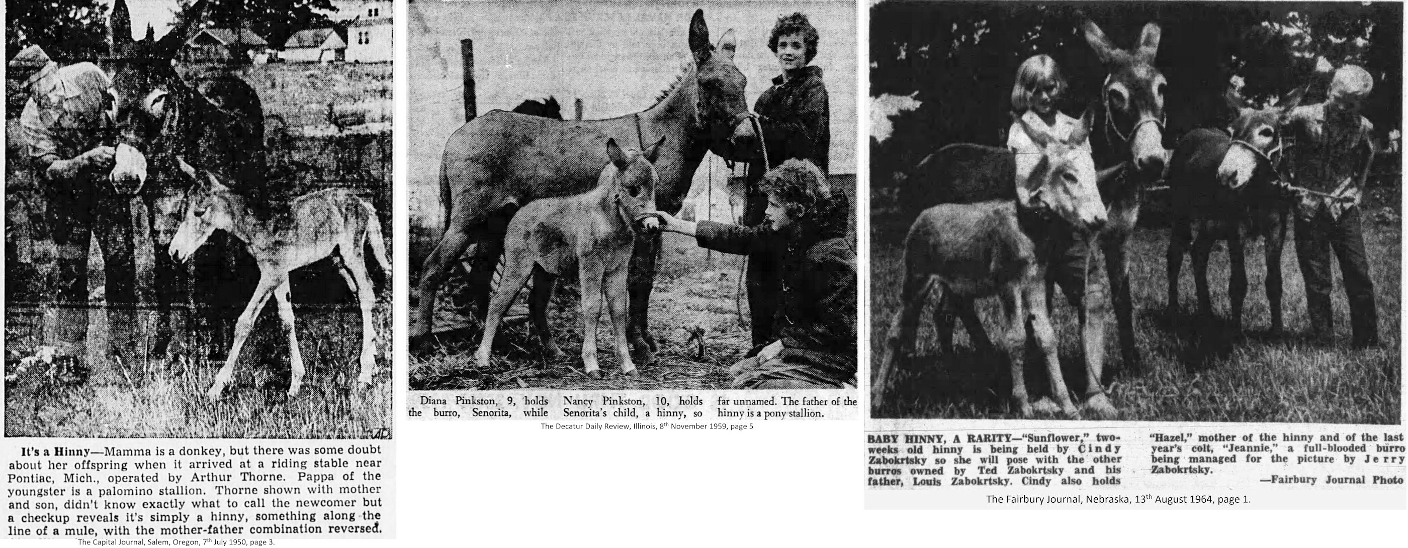 SHE ASS FOALS COLT, GETS 'THE COMICALEST THING' - IT'S A HINNY. Oroville Mercury Register, California, 6th July 1950, page 12.