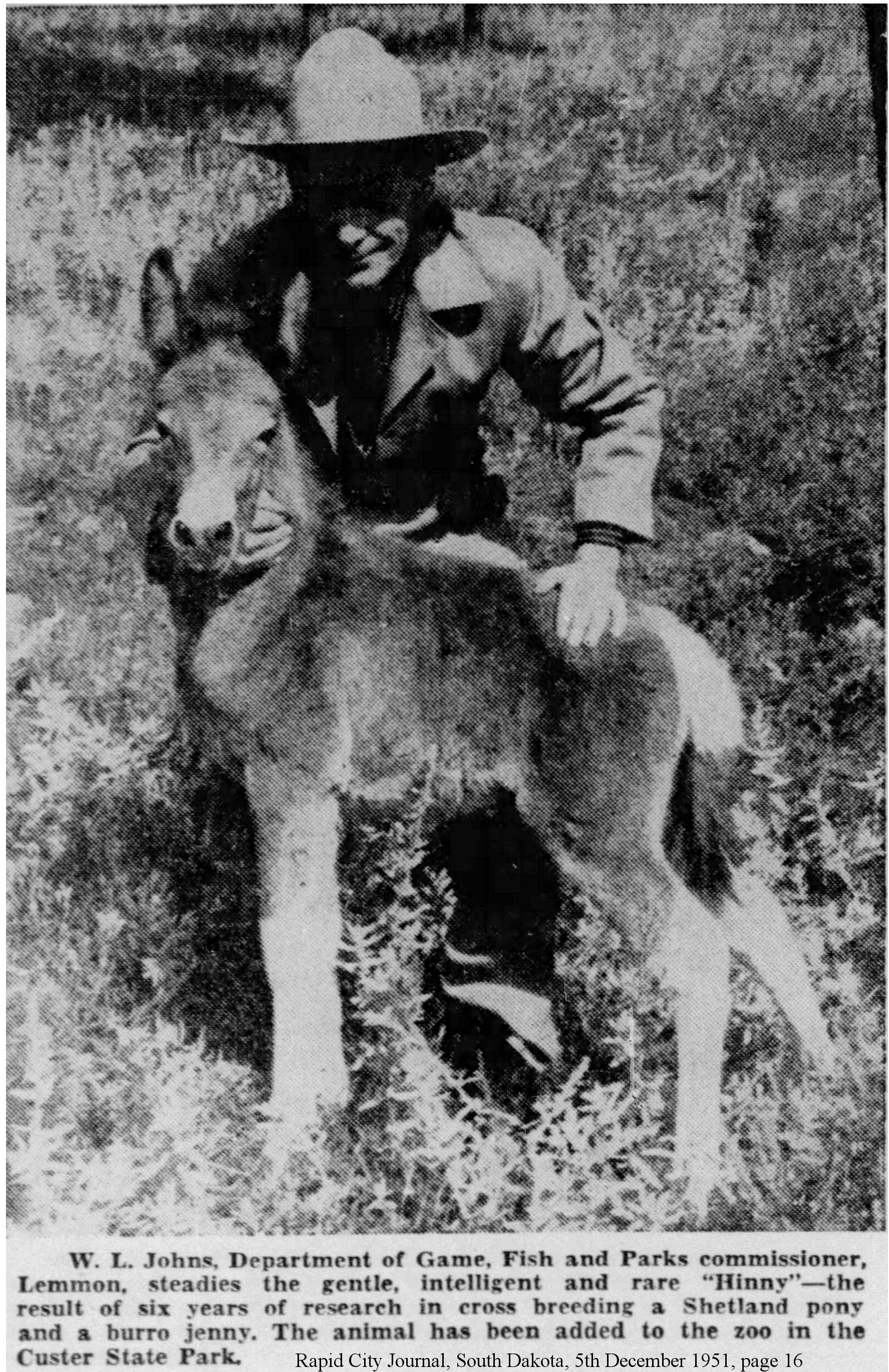 RARE HYBRID ANIMALS, "HINNIES," ROMP AT CUSTER PARK FARM. Rapid City Journal, South Dakota, 5th December 1951, page 16; Argus Leader, Sioux Falls, South Dakota, 9th December 1951, page 32.
