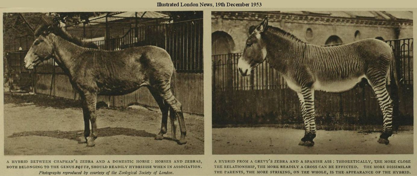 In "Origin of Species" (1859) Charles Darwin mentioned four coloured drawings of hybrids between the ass and zebra. He noted "In Lord Moreton's famous hybrid from a chestnut mare and male quagga, the hybrid, and even the pure offspring subsequently produced from the mare by a black Arabian sire, were much more plainly barred across the legs than is even the pure quagga. Lastly, and this is another most remarkable case, a hybrid has been figured by Dr. Gray (and he informs me that he knows of a second case) from the ass and the hemionus." Darwin described the latter hybrid in "The Variation Of Animals And Plants Under Domestication": The Equus indicus [onager] a hybrid, raised at Knowsley ('Gleanings from the Knowsley Menageries' by Dr. J.E. Gray.) from a female of this species by a male domestic ass, had all four legs transversely and conspicuously striped, had three short stripes on each shoulder and had even some zebra-like stripes on its face! Dr. Gray informs me that he has seen a second hybrid of the same parentage, similarly striped.