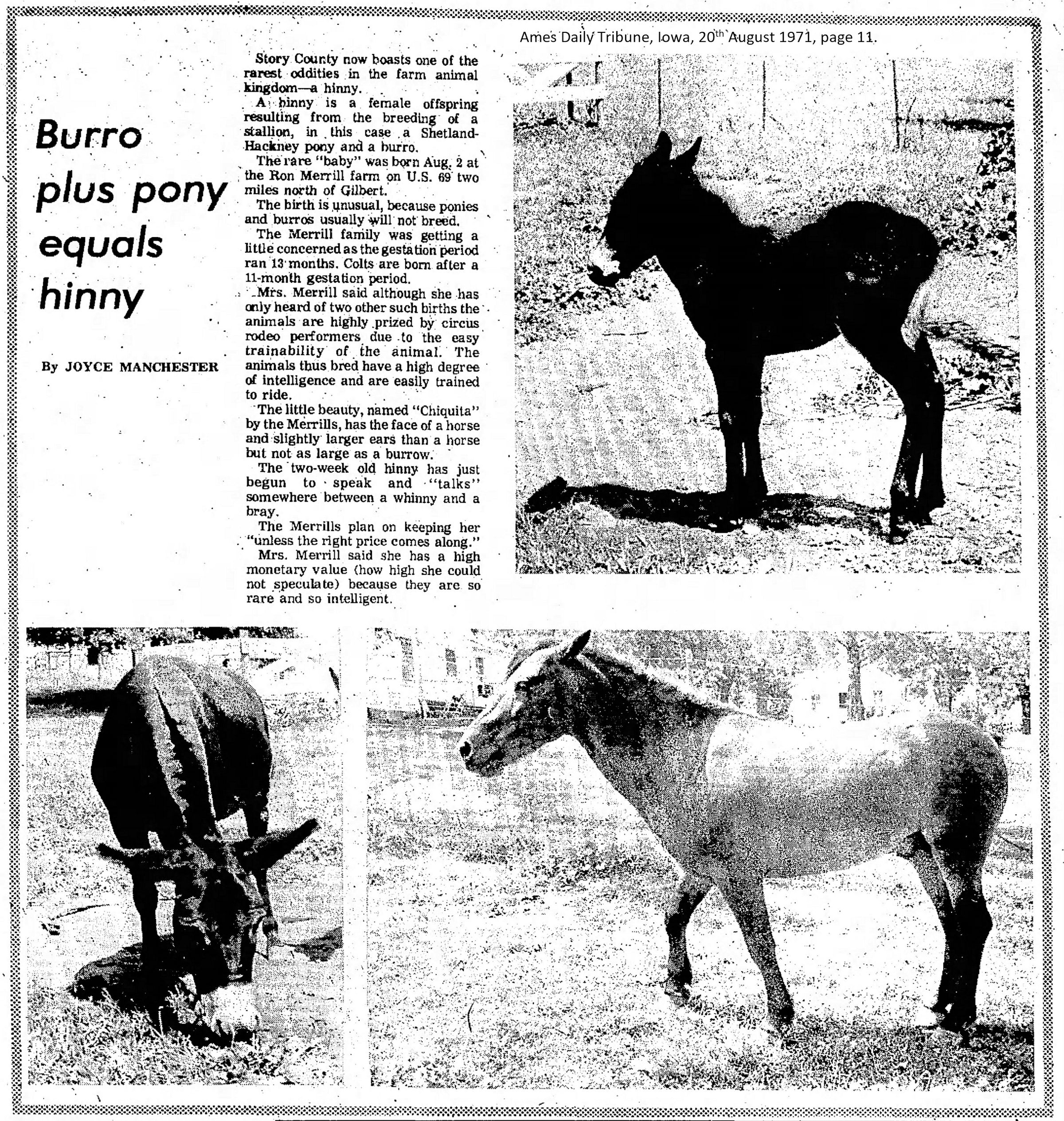 BURRO PLUS PONY EQUALS HINNY. Ames Daily Tribune, Iowa, 20th August 1971, page 11.