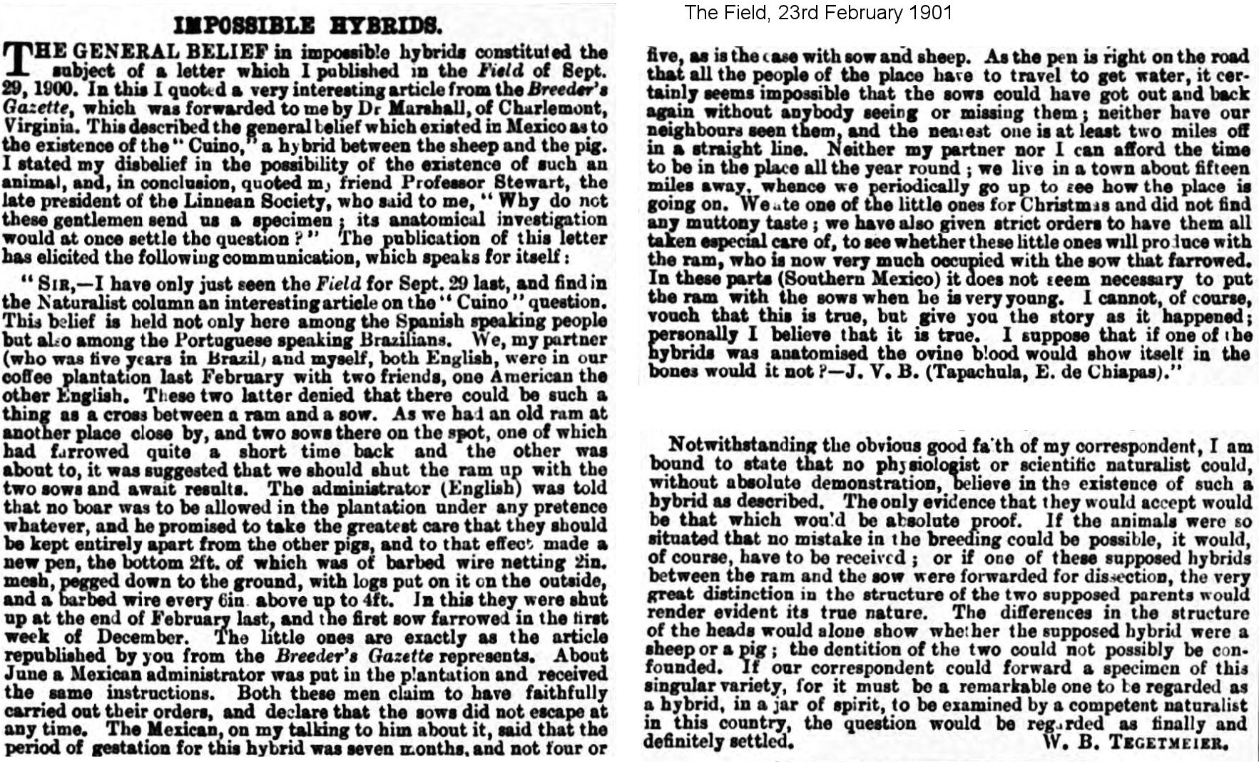 SUPPOSITIOUS HYBRID (The Field, 17th June, 1899). Having noticed in your issue of April 1 a letter concerning a supposed sheep and goat hybrid, I think that perhaps the following maybe of interest to some of your readers. Some three months ago a Mexican came to my ranche and asked me to lend him a pet ram that I had. On inquiring from him for what reason he might require it, I was dumbfounded by his answer: "I want it for a mate for a couple of sows I have." I volunteered to lend the one I had to him, but on hearing that it was a Merino, he declined my offer, saying that he thought it was a common Mexican ram. Naturally enough my curiosity was aroused, and I made it my business to inquire into the cause of such an astounding request. Not only from the man who asked me for the loan of my ram, but also from several other Mexican ranchmen near by, I elicited the following information: