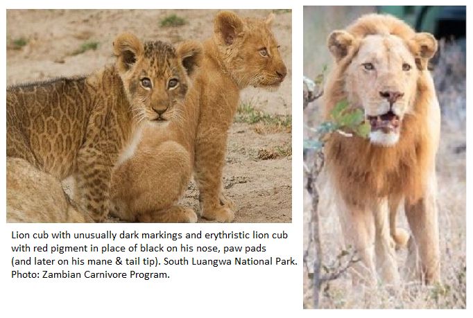 Ginger, from South Luangwa, in Zambia is an erythristic lion. He was one of 3 unusually marked cubs born in 2008. One had such dark markings it resembled a leopard cub. Ginger was born with a very light coloured coat and he hacks the dark pigmentation usually found on the nose and paw pads. His mane and tail tip were orange; the tail tip is usually black.