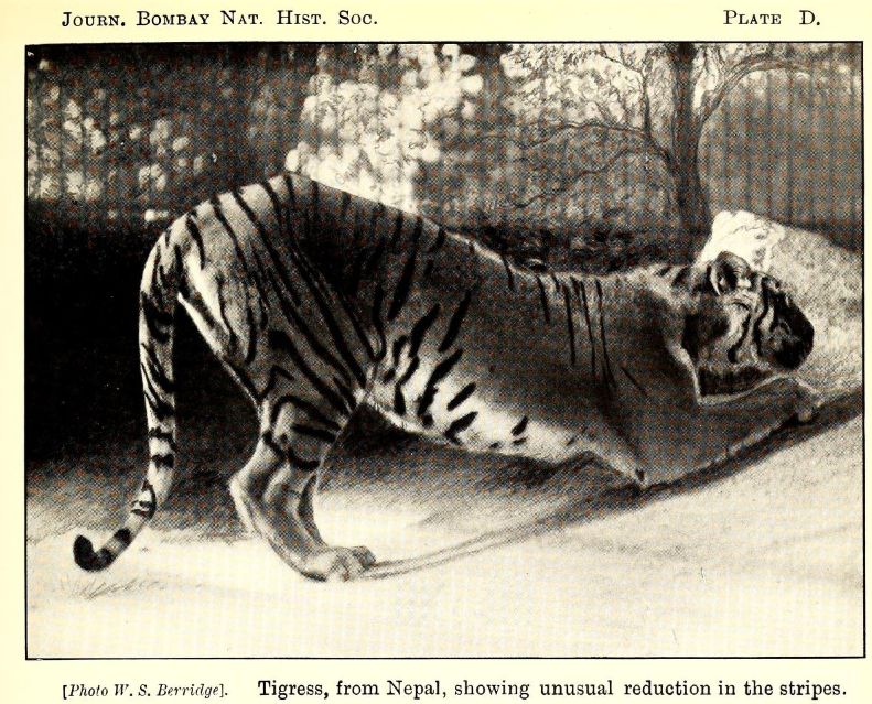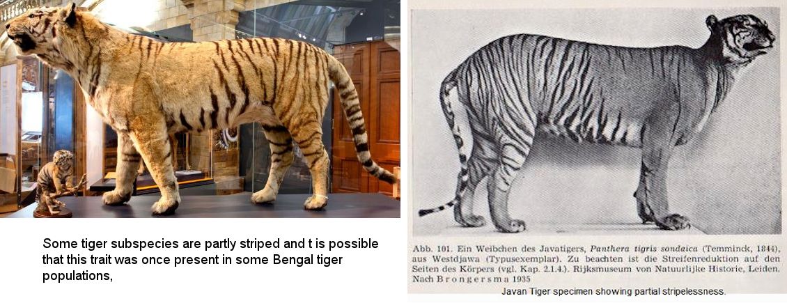 In the JBNHS, 1937 (v39: 1937-8), S H Prater of the Bombay Natural History Society wrote “Mr W H Carter (Times, 16 Oct 1936) writes ‘In one of the official district Gazetteers of Bengal (Khulna or Backerganj) there is mentioned a local variety of tiger which had lost its stripes as camouflage in the open sandy tracts of Sunderbans. The uniform colour scheme adopted was however, brown”. However this differs from the original report in “The Provincial Geography of India – Bengal, Bihar and Orissa, Sikkim,” by LSS O’Malley, 1917 which stated: “…those frequenting the sand dunes along the sea face of the Sundarbans have almost lost their stripes in adaptation to their environment, so that their coats are of a tawny orange with only a few dark lines” which suggests natural selection for a less heavily striped form.