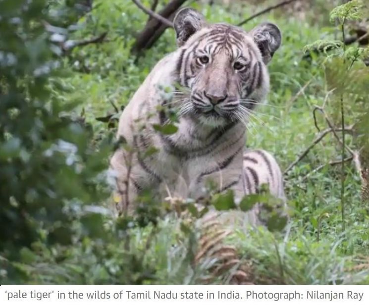 An exceptionally rare PALE TIGER was photographed in the wild in southern India in 2017, and may be the palest known tiger living in the wild, the white colour morph now being extinct in the wild. The pale tiger, a sub-adult of unknown gender, was photographed by Nilanjan Ray in Nilgiri biosphere reserve in Tamil Nadu state. Pale tigers, which are distinct from white tigers, occur in environments with large, random mating pools and plenty of genetic diversity. A pale tiger was previously seen in the Ranthambore national park in Rajasthan in the 1980s, but was not as pale as the Tamil Nadu pale tiger. Unlike the mixed-blood pale tigers in captivity, this tiger is a pure Bengal tiger.