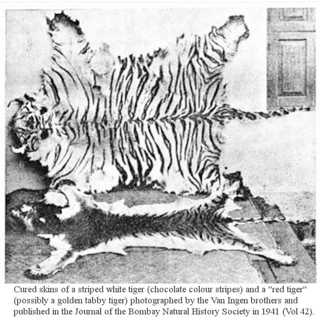 In Assam, in 1929, two light-coloured red tigers, which we might now call golden tabby tigers, were shot. According to the Van Ingen brothers who provided the photograph to the JBNHS: “The red tigress in the foreground was shot some years ago in Assam by the late Mr W G Forbes. The skin was white with the pale tan background and marked with fine stripes in a darker shade of tan. Curiously the three last stripes at the tip of the tail were black. The white tiger shown in comparison was pure white and marked with chocolate stripes. This tiger was shot by the Ruling Chief of Korea [i.e. Koriya princedom] also some years ago.” “Variation in Colour of Tigers and Panthers” by Van Ingen & Van Ingen, in JBNHS v.42:pt.3-4 (1942). J.C.Daniel provided further information on the skins in his 2001 book “The Tiger in India”: The two light-coloured tigers shot by W.G. Forbes of Hathikuli Tea estate in 1929 were described at the time of curing by Messrs. Van Ingen as ‘red tigers’.