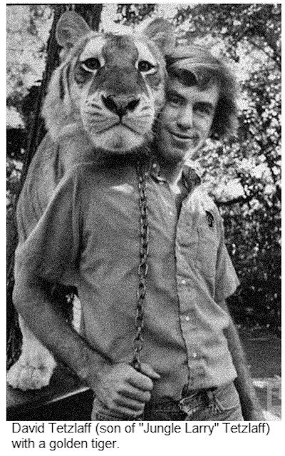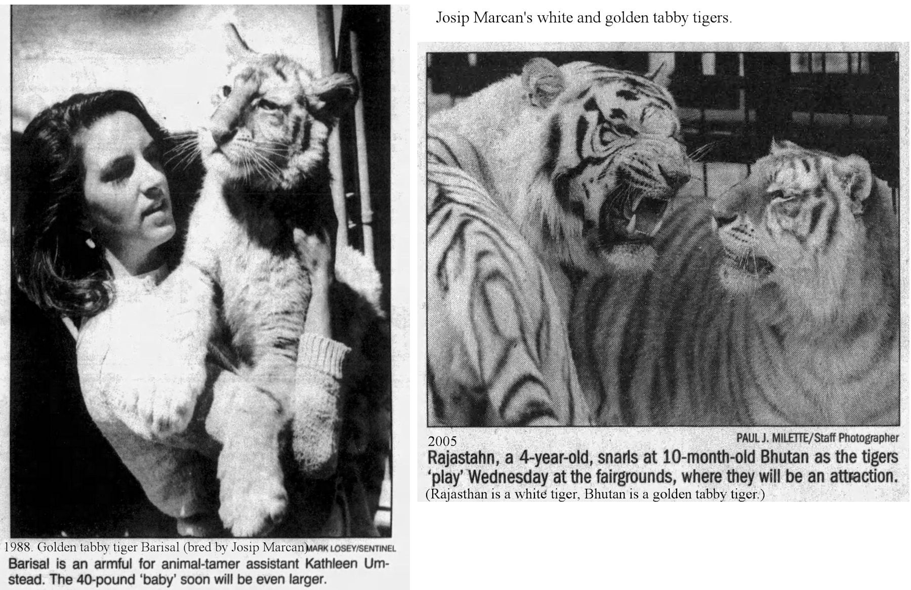 In 1996, Josip Marcan exchanged one of his golden tabby tiger cubs for two normal orange tiger cubs owned by “Tiger Lady” Joan Byron-Marasek (Tigers Only Preservation Society, Route 537, Jackson, New Jersey). Byron-Marasek later lost her permit to keep tigers a tiger got loose on 27th January 1999 and subsequent investigations found conditions at her facility to be squalid and substandard. In 2003 the court ruled that her tigers be handed over to the Wild Animal orphanage in San Antonio, Texas, presumably including the golden tabby tiger. There is no report of Marcan retrieving his tiger, and no other information about it, but the last of the Byron-Marasek tigers died in 2019.