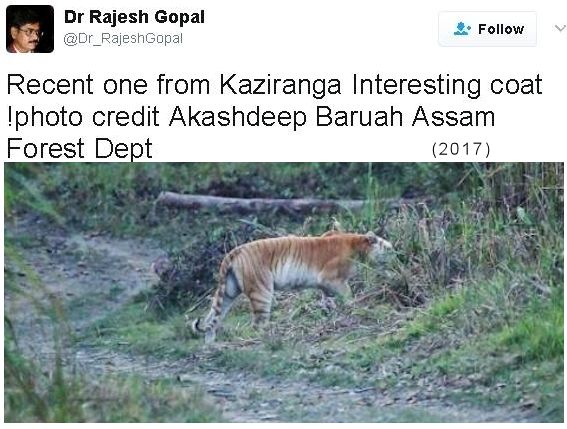 This photo on Twitter by Akashdeep Baruah of the Assam Forestry Dept, India, appears to show a golden tiger. It has the pale limbs and pale face indicative of that colour morph. This would mean that the recessive wide-band gene is still present in the tiger population in that region. This is the same region where stripeless white tigers were reported in the 1800s.
