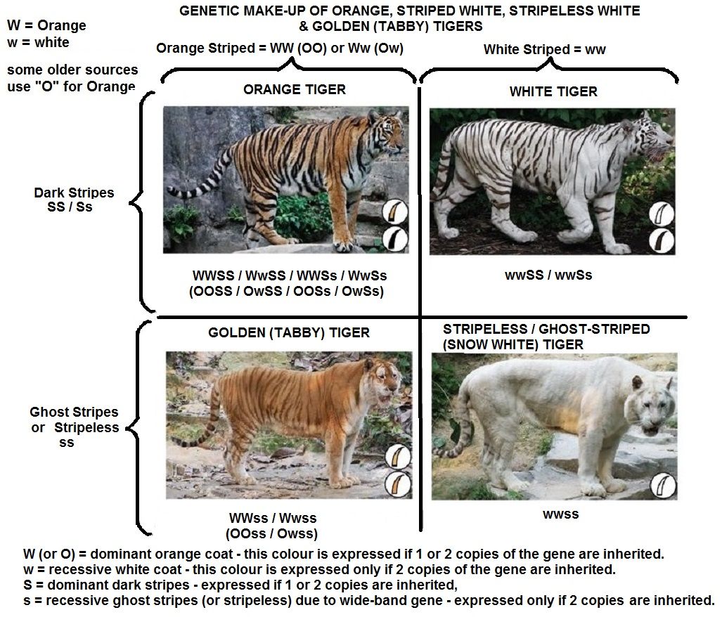 There were no golden tabby tigers or stripeless white tigers reported at the Hawthorn Circus (which bred white tigers extensively) so the gene did not appear to be present in that breeding population. The first confirmed captive-bred golden tiger (outside of Asia) was probably born at the Cincinnati Zoo (where the first stripeless whites were born) and possibly to white tiger Bhim and his orange sister Kamala. Ed Maruska, the zoo director, was pictured holding a golden tiger cub. Andy Goldfarb referred to them as "strawberries." A golden tiger was acquired on loan by Glasgow zoo after someone there saw Columbus Zoo director Jack Hanna on TV with a golden tiger. Glasgow Zoo's golden tiger Butu (Bhutto) came from Longleat and was from the Columbus Zoo strain. Glasgow Zoo were of the impression that golden tigers necessarily carry white genes and are intermediate between white and orange. The colour coded chart of Bhim and Indira's descendents indicates that golden tabby tigers are orange/orange carrying white with an additional recessive gene - wide-band is the most likely candidate. Wide band would also cause ghost-striped white tigers. For a golden tabby mated to a white to have orange offspring means the golden tabby must be genetically orange. It seems that Chandi does not carry the golden gene, but Kaddu does.