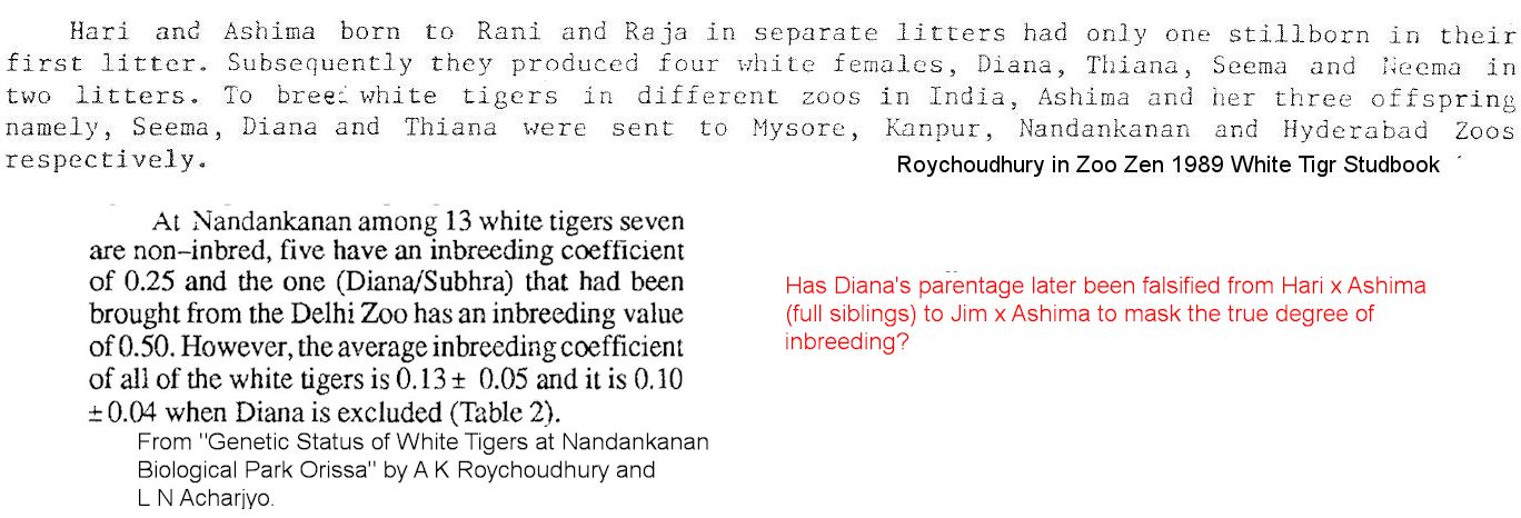 Transcription errors in the studbook make them appear less inbred – a transcription error of a death date means Jim is erroneously shown as siring white cubs that were actually produced by Hari x Ashima (siblings).