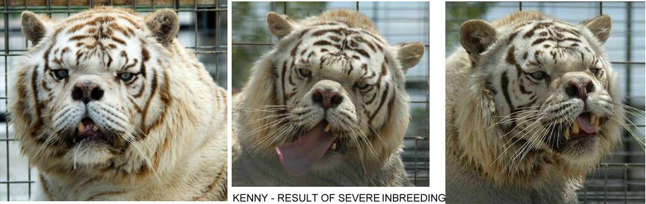 A famous example of the results of excessive inbreeding is Kenny Rogers who lived at the Turpentine Creek Wildlife Refuge, Eureka Springs, Arkansas. Kenny was born on 04.04.98 at Bentonville, Arkansas (probably Don Blount's establishment), and had a deformed nose and snaggle teeth which gave him a both fearsome and pitiful appearance. His unshed “baby” canine teeth competed with his adult canine teeth for space in his mouth. Because of the crowded teeth and deformed skull, he could not completely close his mouth and constantly drooled and slobbered. His pug-like nose was pushed into his face, obstructing his breathing. This made him unsaleable and therefore worthless to his breeders. The inbreeding also affected his mental capacities and personality. Kenny was non-aggressive and became very friendly with his keepers. He required surgery in 2007 and 2008 for tumours and died on 28.6.2008, aged 10, due to cancer. He was rescued with Willie, an orange tiger (probably carrying the white gene) with lesser deformities (severe cross eyes), but also unsaleable and who died aged 12.